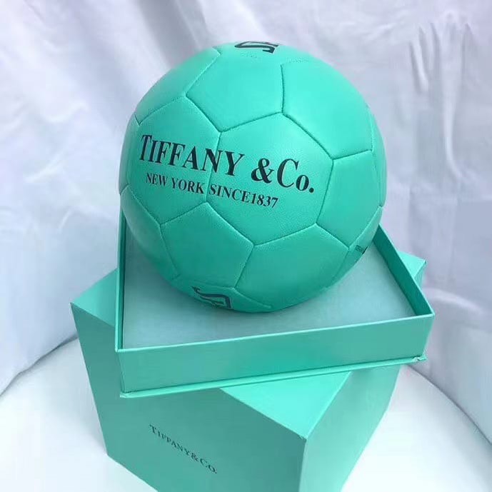 Представляем вам эксклюзивный мяч Tiffany&Co LUX-46003. Этот яркий бирюзовый мяч, украшенный фирменным логотипом Tiffany & Co. и надписью "New York Since 1837", выполнен в классическом дизайне футбольного мяча. Он станет стильным дополнением к интерьеру или оригинальным подарком для ценителей бренда.