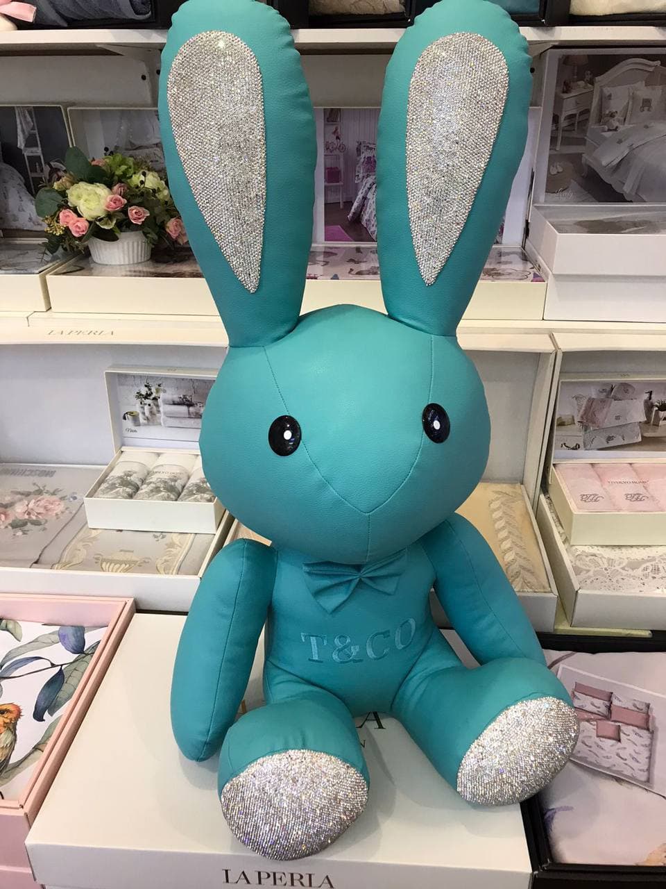 Эта большая, 82-сантиметровая игрушка заяц Tiffany&Co LUX-58500 выполнена в изысканном голубом цвете и украшена сверкающими вставками, напоминающими кристаллы. Её дизайн сочетает в себе классическую форму игрушки с элементами роскоши, что делает её не только милым компаньоном, но и стильным элементом декора. Детали, такие как вышивка "T&CO" на животе и бант-бабочка, подчеркивают её эксклюзивность.