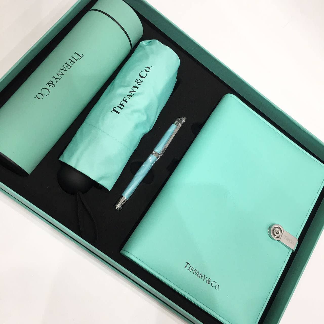 Набор подарочный Tiffany&Co LUX-60993 — это элегантный комплект, выполненный в фирменном стиле Tiffany&Co. Набор включает в себя зонт, блокнот и ручку, оформленные в нежном бирюзовом цвете, что делает его идеальным подарком для ценителей изысканных аксессуаров.