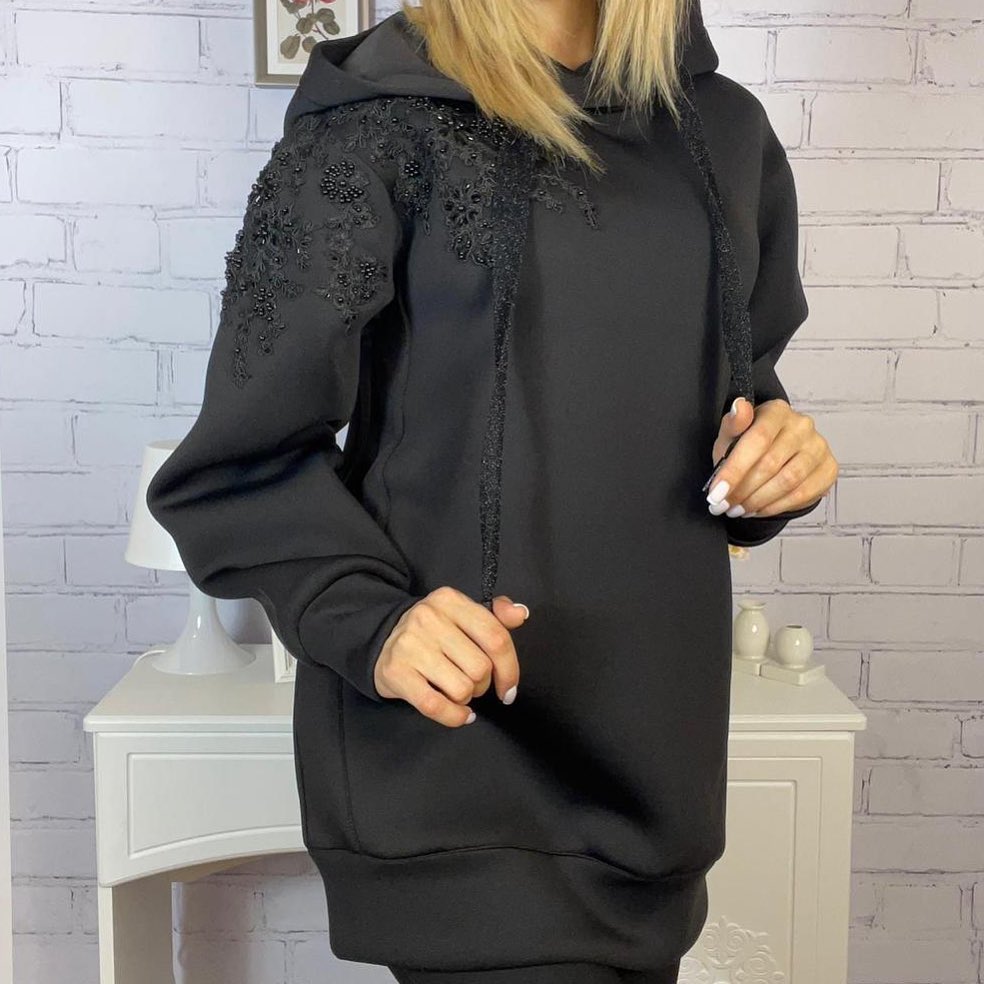 Эта черная толстовка с капюшоном от LUX-CRIME сочетает в себе спортивный комфорт и элегантность. Декоративная вышивка с бисером на плечах придает изделию изысканность, делая его подходящим не только для повседневного, но и для более нарядного образа. Свободный крой обеспечивает максимальную свободу движений.