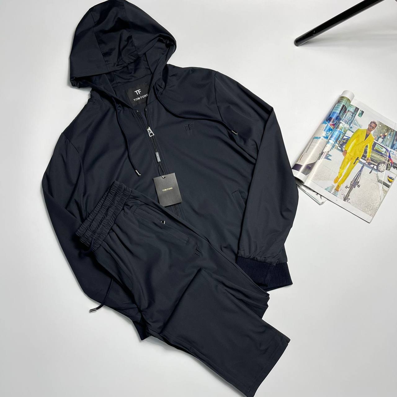 Костюм спортивный Tom Ford LUX-106994 – это элегантный спортивный костюм черного цвета, сочетающий в себе стиль и комфорт. Костюм состоит из куртки с капюшоном и брюк, идеально подходящих для активного отдыха или создания повседневного образа.