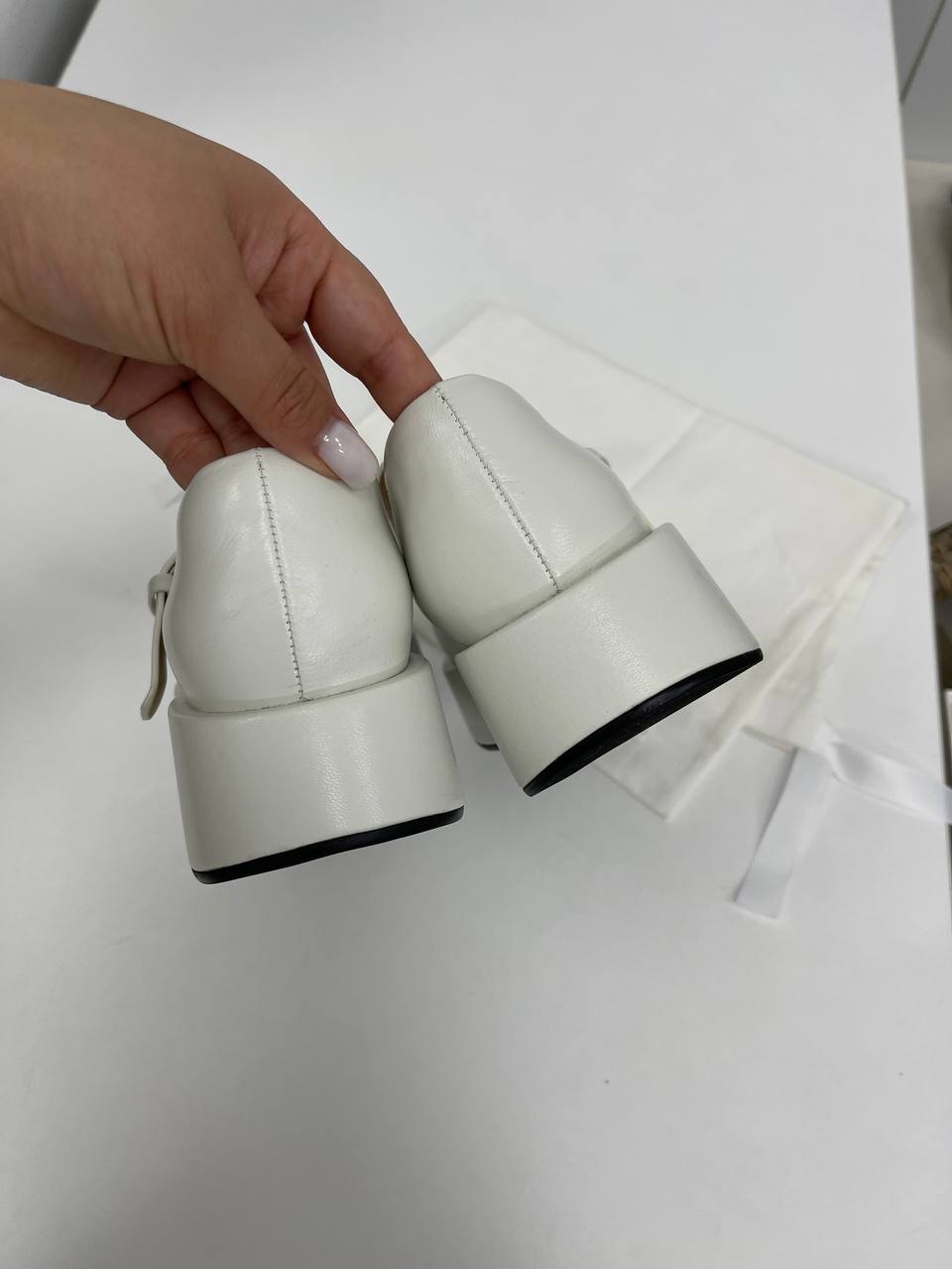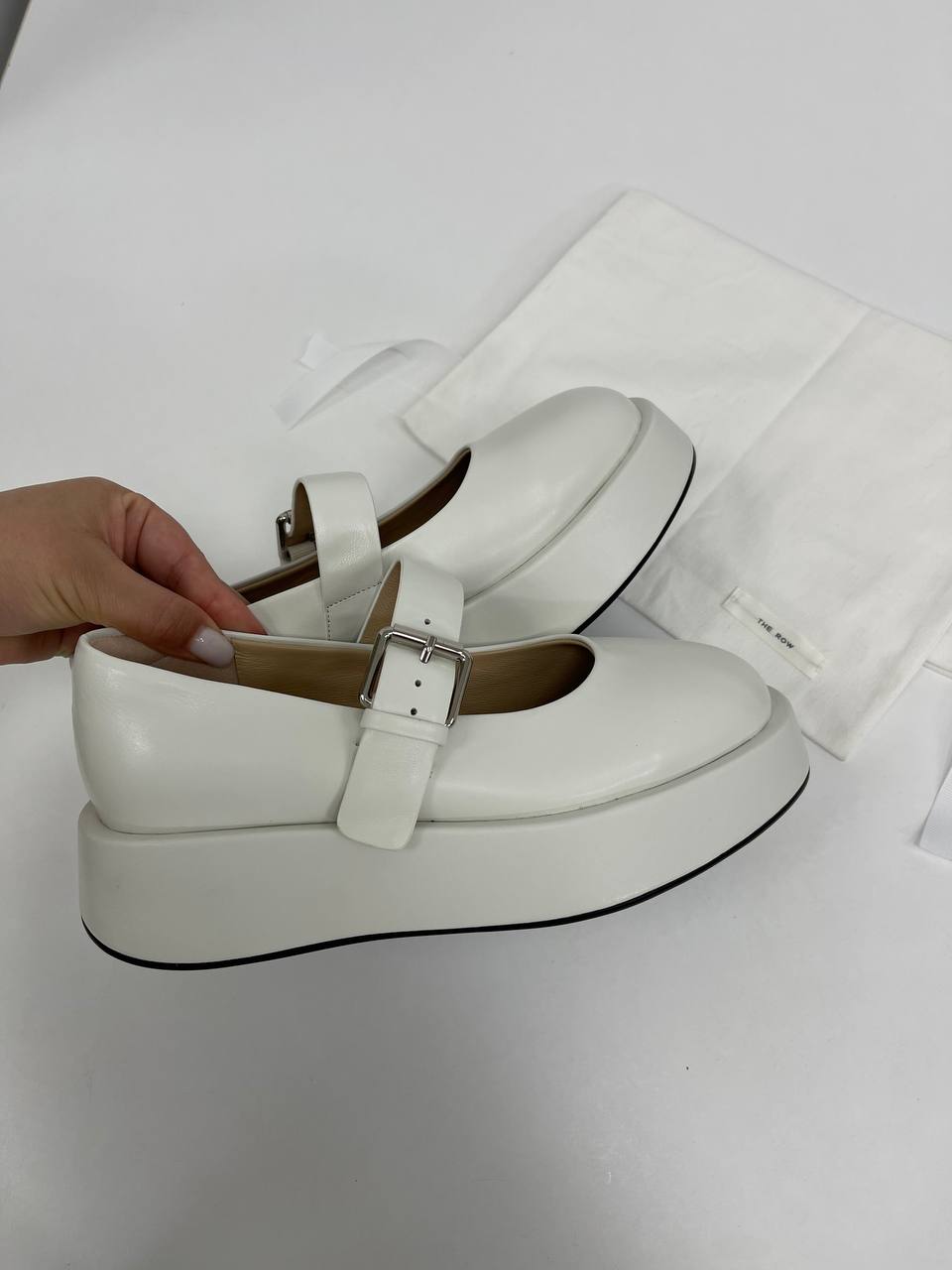 Туфли The Row LUX-90303 — это элегантные белые туфли на массивной подошве, выполненные в классическом стиле «Мэри Джейн». Они имеют круглый носок и ремешок с пряжкой, что придает им изысканный и современный вид. Эти туфли идеально подойдут для создания стильных и комфортных образов.