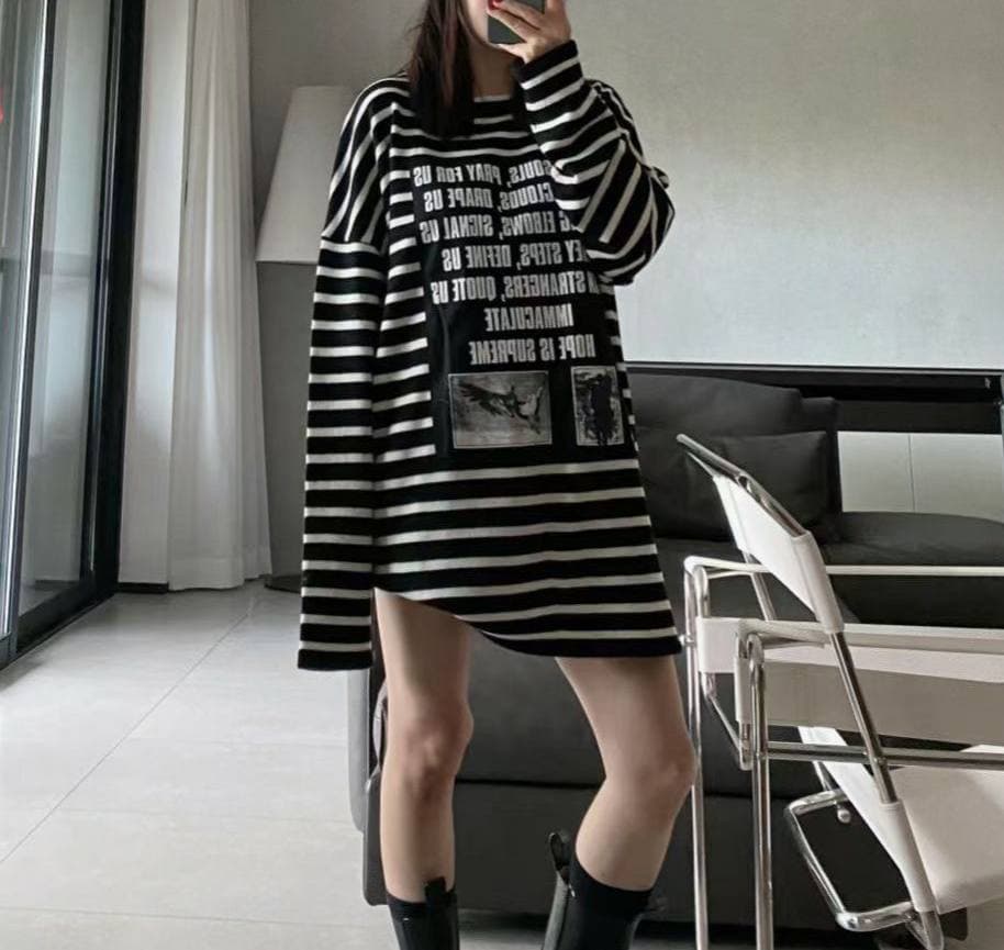 Эта стильная туника LUX-61232 от бренда LUXE-CRIME выполнена в современном стиле оверсайз, идеально подчеркивающим расслабленный образ. Черно-белая полоска в сочетании с графическими принтами и надписями придает ей уникальность и выразительность. Туника отлично подойдет для создания модных повседневных и уличных луков.