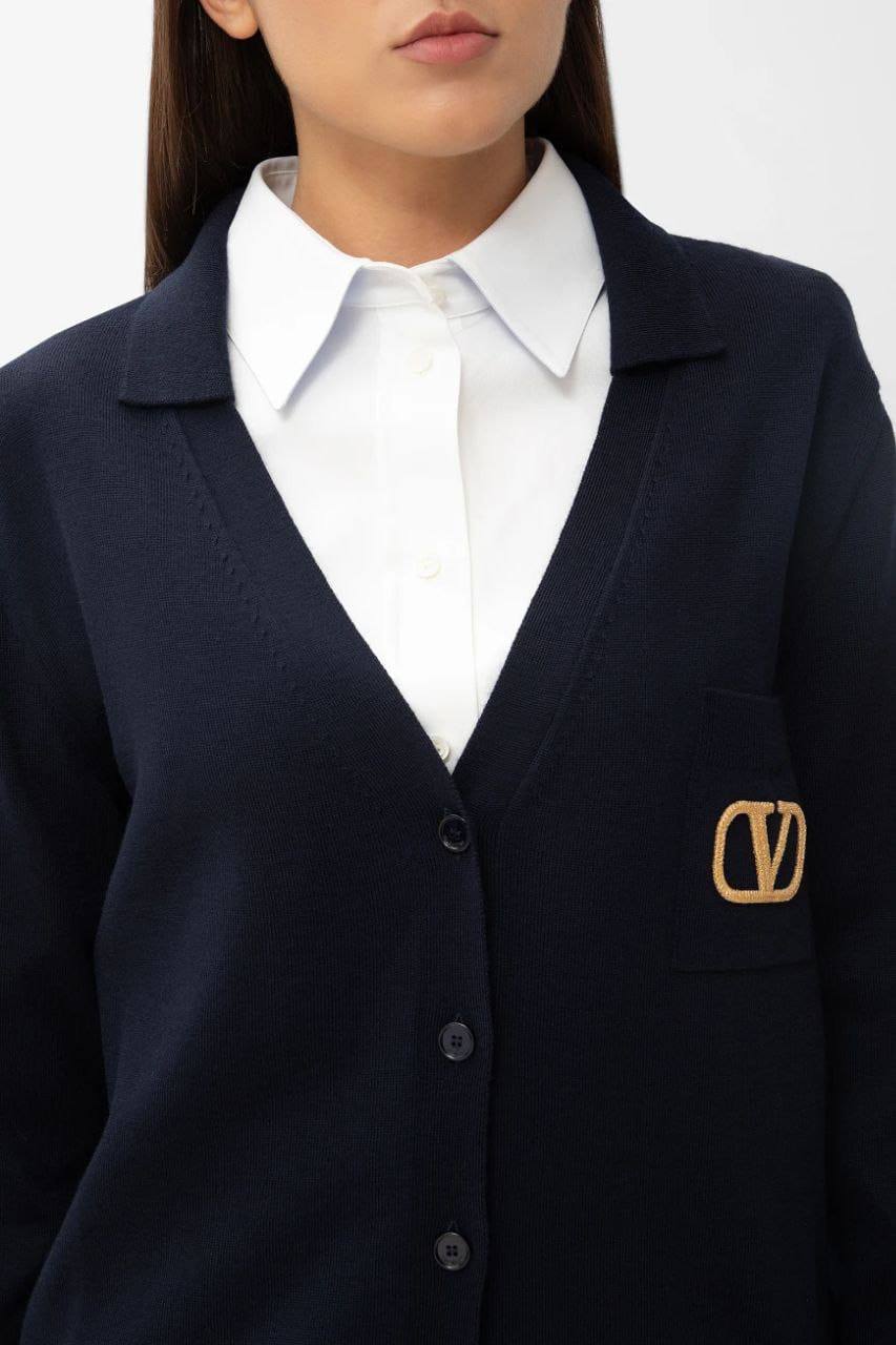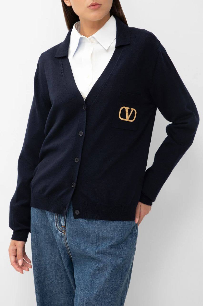Кардиган Valentino LUX-110492 – это стильный предмет гардероба, который подойдет для различных образов. Кардиган выполнен в классическом темно-синем цвете с V-образным вырезом и пуговицами. На груди расположен золотистый логотип.
