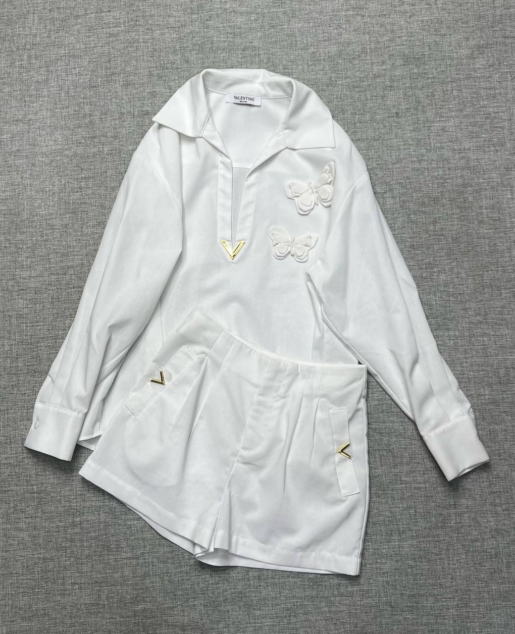 Костюм Valentino LUX-115768 – это элегантный комплект в белом цвете, который сочетает в себе изысканный стиль и комфорт. Этот костюм состоит из рубашки с длинными рукавами и шорт, что делает его идеальным выбором для летнего гардероба. Дизайн украшен декоративными элементами в виде бабочек и золотистыми деталями.