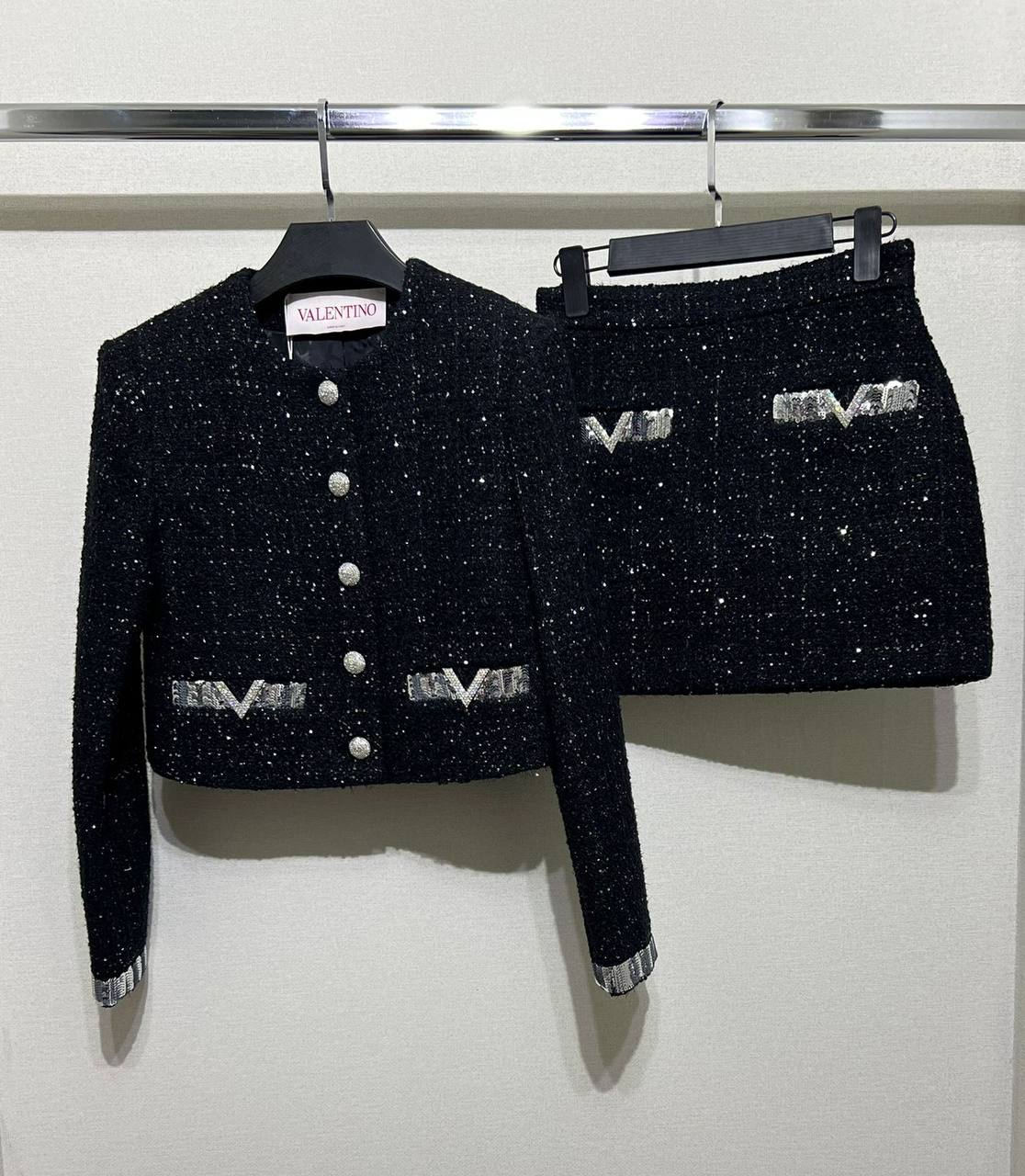 Костюм женский Valentino LUX-103873 – это элегантный ансамбль, который воплощает стиль и роскошь бренда. Черный костюм из жакета и юбки-шорт идеально подходит для создания изысканных образов. Мерцающая текстура ткани и серебряные детали придают образу особую привлекательность.