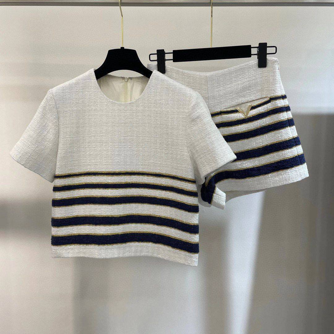 Костюм женский Valentino LUX-101634 — это стильный комплект, состоящий из топа и шорт. Белый цвет основы гармонично сочетается с темно-синими и золотистыми полосами, создавая элегантный образ. Идеально подходит для создания повседневных и нарядных образов.