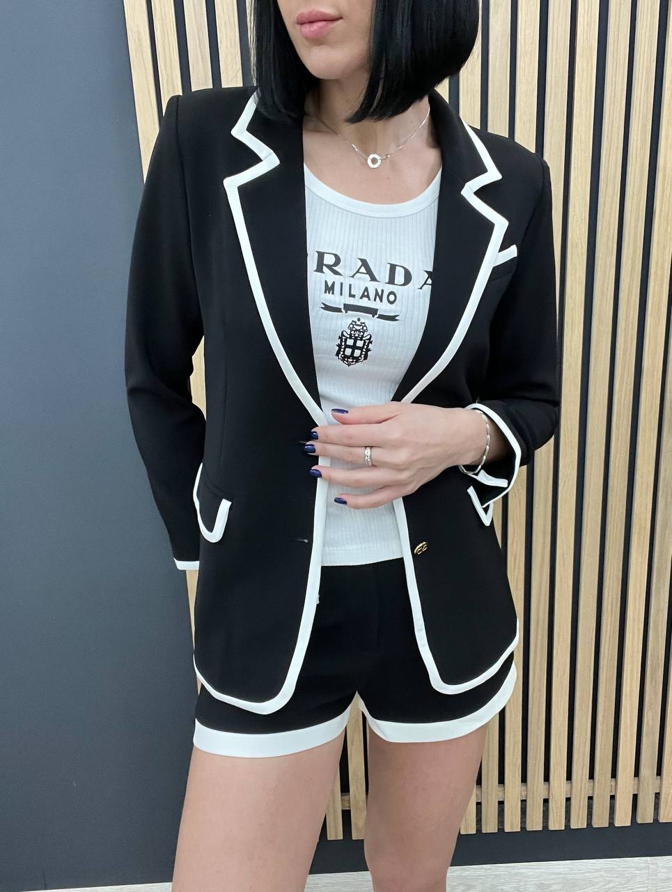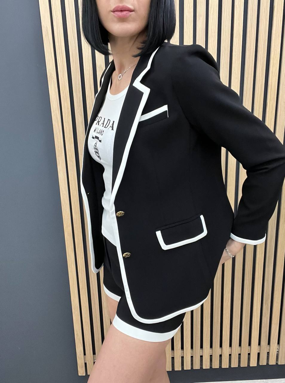 Костюм женский Valentino LUX-103663 — это стильный костюм, включающий в себя жакет и шорты, выполненный в классическом стиле. Костюм сочетает в себе элегантность и современность. Комплект выполнен в черно-белой цветовой гамме, что делает его универсальным для различных мероприятий.