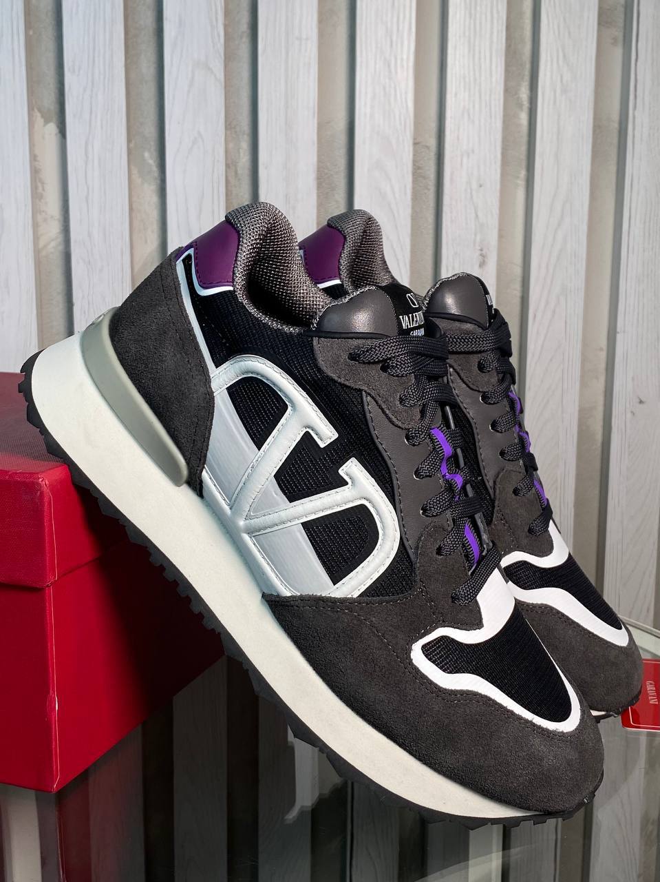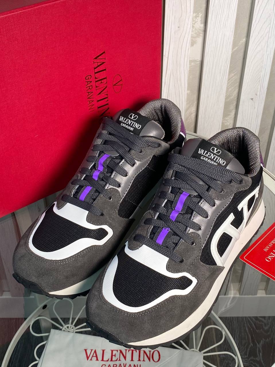 Кроссовки Valentino LUX-114786 представляют собой спортивную обувь в современном стиле. Кроссовки выполнены в серо-черной цветовой гамме с белыми и фиолетовыми акцентами. Дизайн модели подчеркивает логотип бренда на язычке и боковой части.