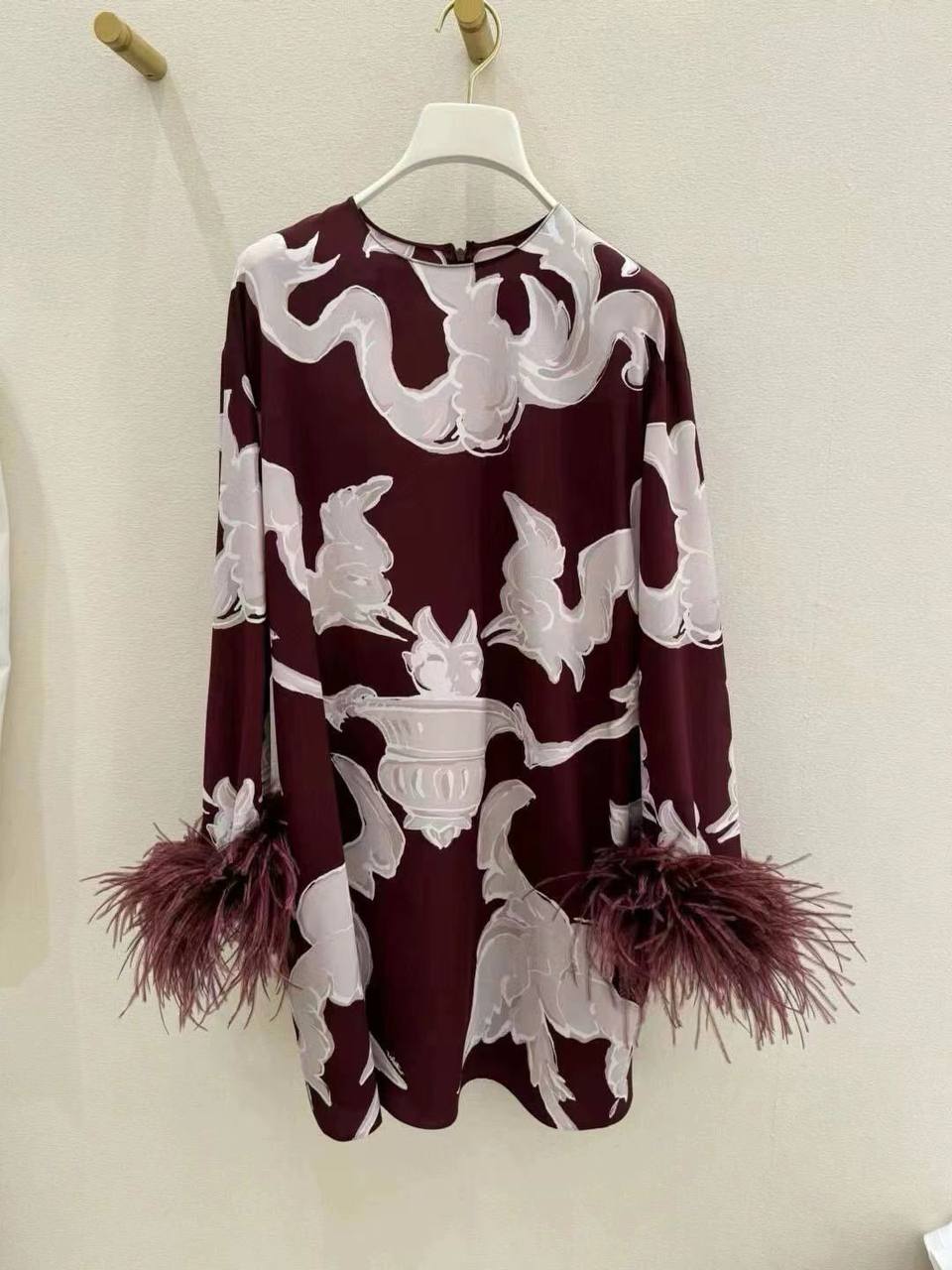Платье Valentino LUX-107125 представляет собой элегантное платье с длинными рукавами и принтом. Платье выполнено в бордовом цвете с белым узором и украшено перьями на манжетах, что придает ему изысканность и неповторимый стиль. Идеально подойдет для особых случаев, торжественных мероприятий или вечерних выходов.