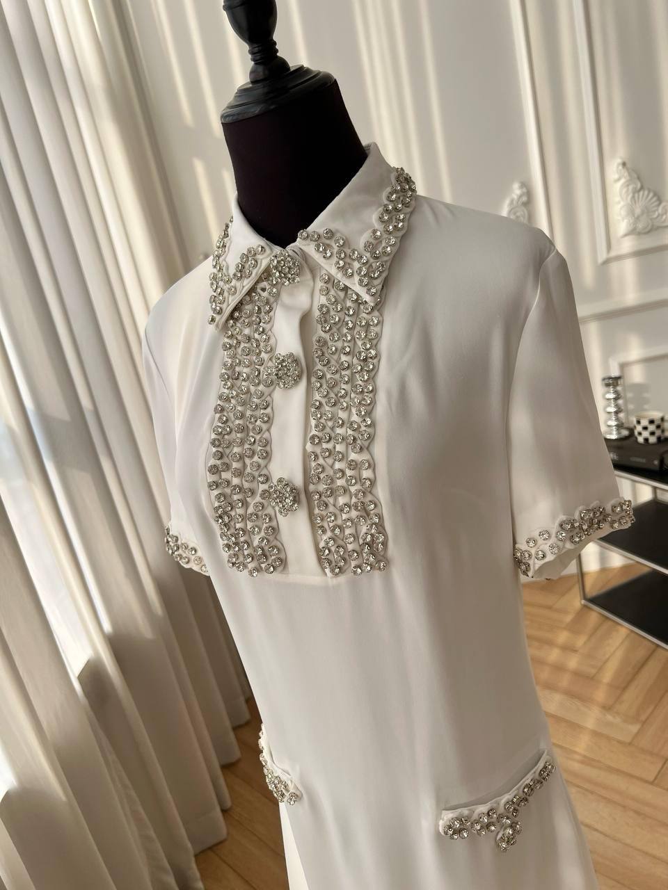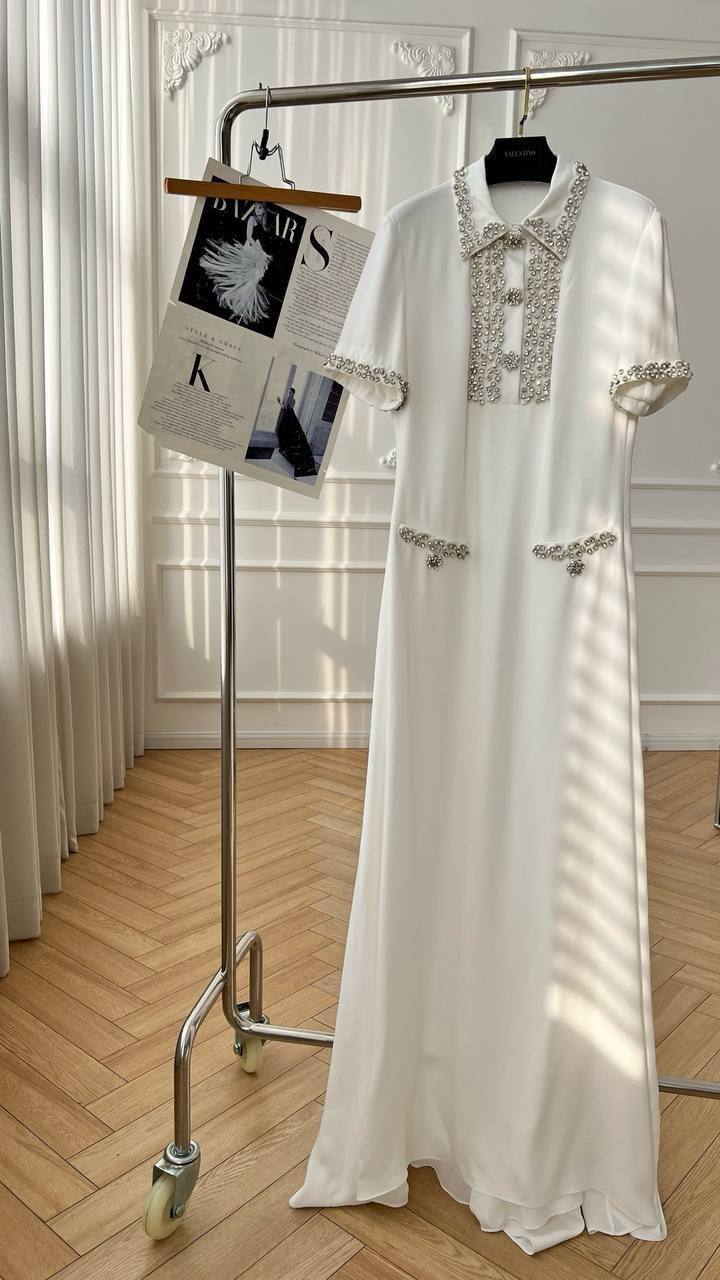 Платье Valentino LUX-116897 - это элегантное платье белого цвета, которое идеально подходит для создания изысканного образа. Классический дизайн, украшенное декором из страз, делает платье идеальным выбором для особых случаев.