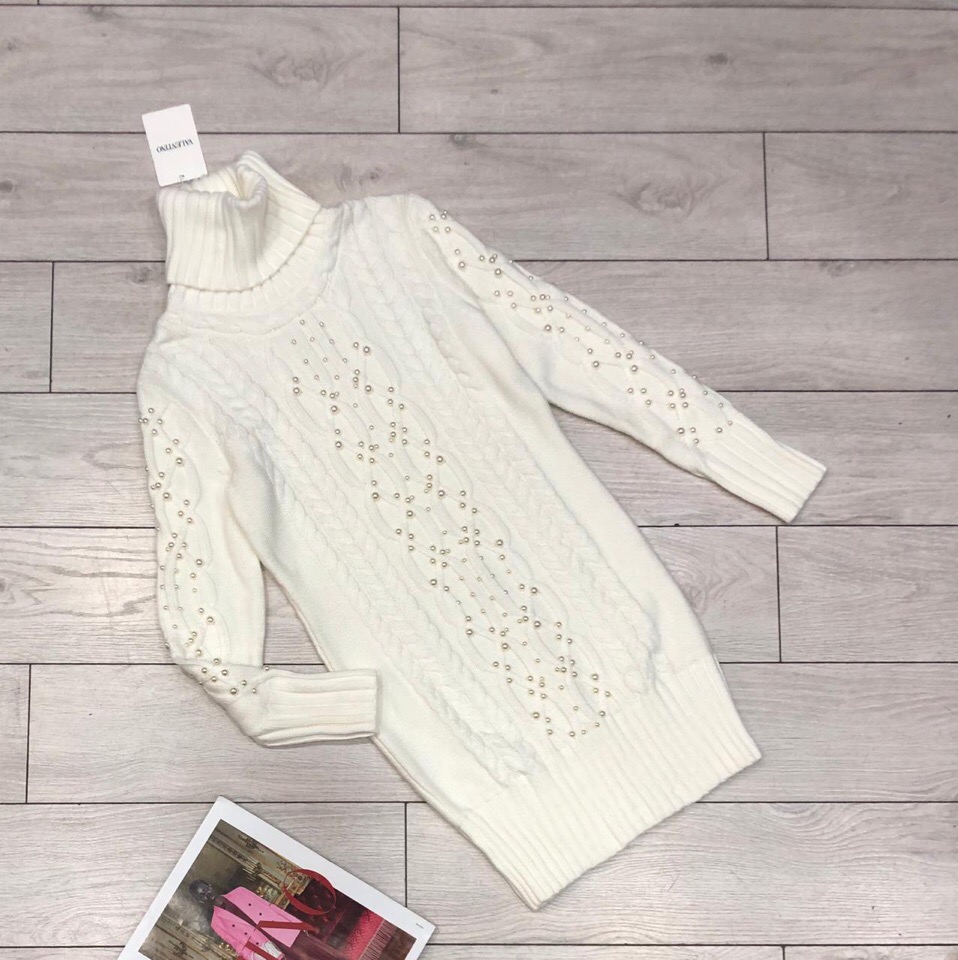 Платье Valentino ОДЖ-986 – это элегантное вязаное платье с высоким воротом и объемным узором "косы". Оно украшено жемчужными бусинами, которые придают ему изысканность. Идеальный выбор для создания стильного и теплого образа в прохладную погоду.