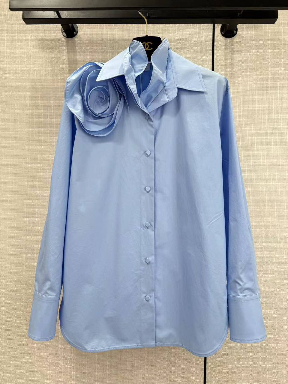 Рубашка Valentino LUX-100744 — воплощение элегантности и стиля. Нежно-голубой цвет рубашки придает ей воздушность и легкость. Декоративный элемент в виде цветка на плече делает ее запоминающейся.
