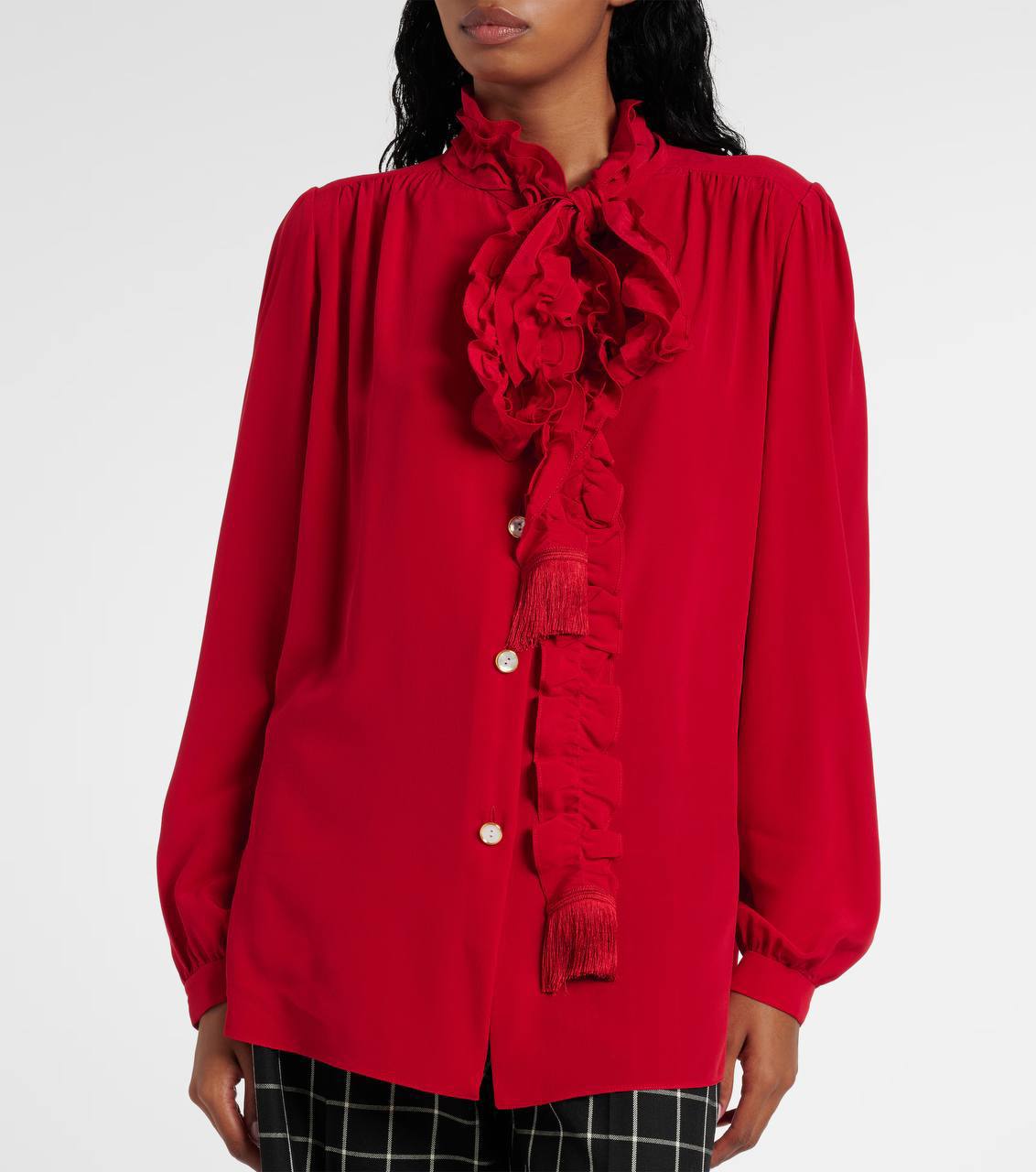 Рубашка Valentino LUX-118186 – это элегантная рубашка в ярком красном цвете, выполненная в изысканном стиле. Она украшена эффектным воланом, начинающимся от воротника и спускающимся вдоль всей планки, добавляя образу женственности и шарма. Прекрасно подойдет для создания запоминающихся образов на особые случаи.