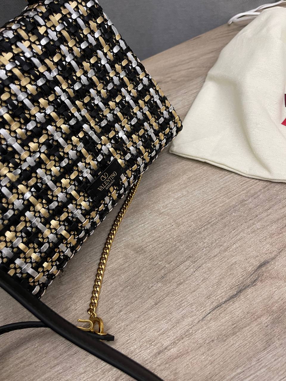 Женская сумка Valentino LUX-101589, представленная на изображении, выполнена в классическом стиле. Она сочетает в себе черный, золотистый и белый цвета, образуя элегантный узор. Эта сумка идеально подходит для повседневного использования, а также для особых случаев.
