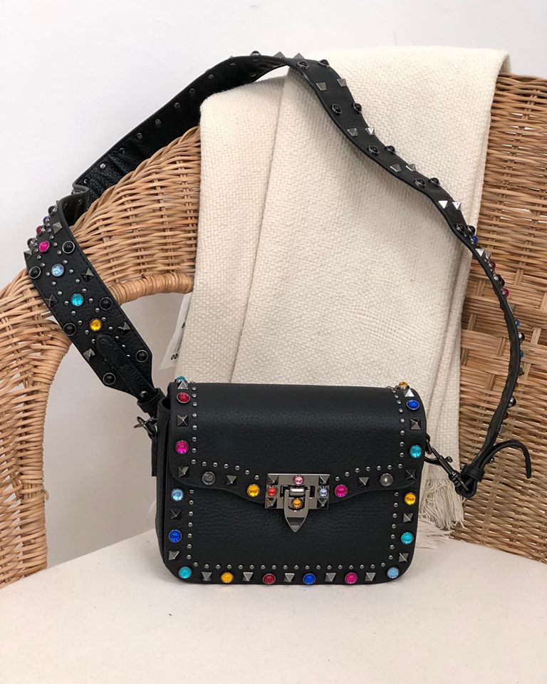 Сумка женская Valentino LUX-26070 – это яркий и эффектный аксессуар, выполненный в узнаваемом стиле бренда Valentino. Модель средней жесткости, с клапаном и декоративной застежкой, украшена фирменными заклепками и разноцветными кристаллами, которые придают ей особый шарм. Такая сумка станет акцентом в любом образе, подчеркивая индивидуальность владелицы.