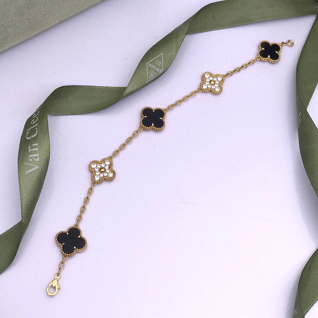 Браслет Van Cleef LUX-87014 — изысканное украшение, сочетающее в себе элегантность и утонченность. Золотистый браслет украшен четырьмя элементами в форме четырехлистного клевера, два из которых черного цвета, а два — с кристаллами. Этот браслет станет прекрасным дополнением к любому образу, подчеркивая индивидуальность своей обладательницы.