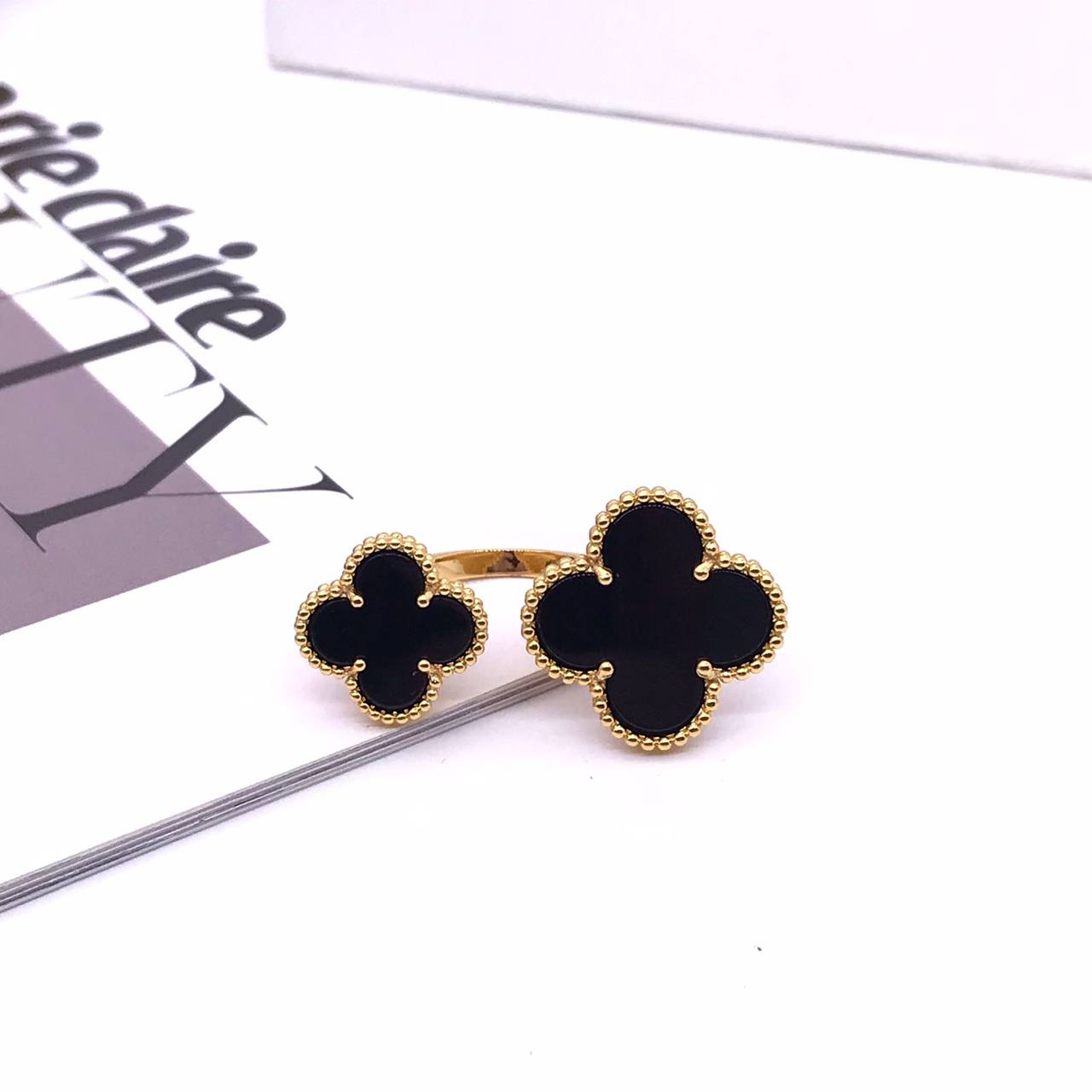 Кольцо Van Cleef LUX-71075, представленное на изображении, выполнено в узнаваемом стиле бренда, воплощающем элегантность и изысканность. Кольцо выполнено в форме двух клеверных листочков черного цвета с золотистой окантовкой, оно излучает роскошь и утонченность. Этот аксессуар станет ярким акцентом в образе, подчеркивая индивидуальность и хороший вкус.