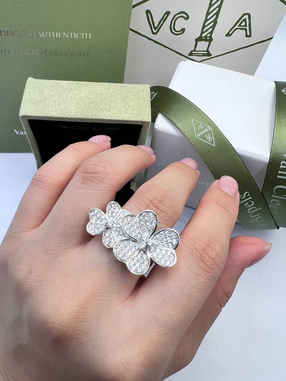 Кольцо Van Cleef LUX-117061 – изысканное украшение, которое подчеркнет ваш стиль и элегантность. Кольцо выполнено в виде двух цветков, инкрустированных сверкающими камнями. Такой дизайн делает его подходящим для различных образов, добавляя нотку роскоши.