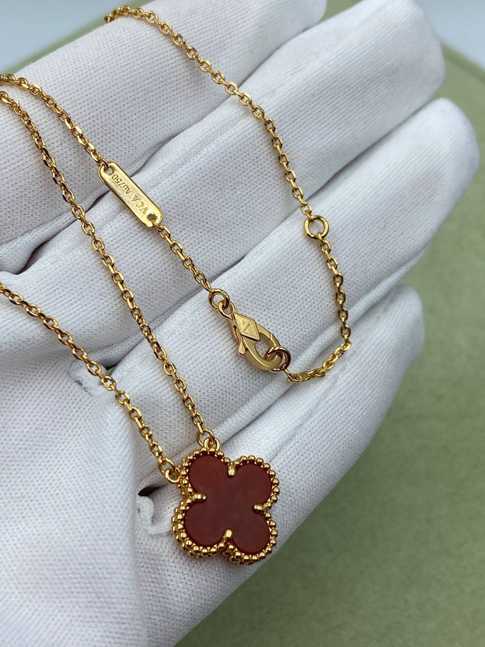 Колье Van Cleef LUX-96283 - это элегантное украшение, выполненное в классическом стиле. Золотистая цепочка гармонично сочетается с подвеской в форме четырехлистного клевера насыщенного терракотового цвета. Такое колье станет прекрасным дополнением к любому образу.