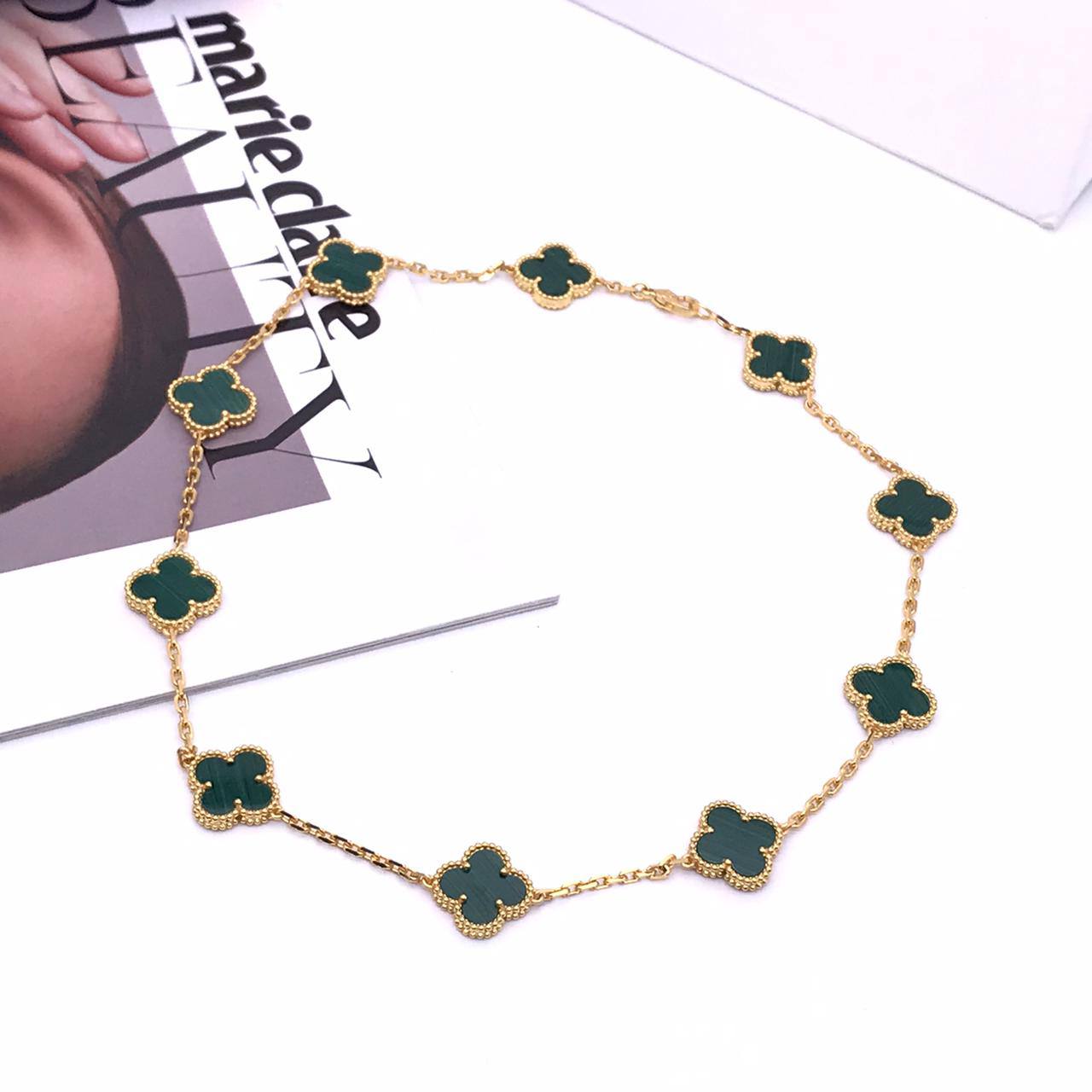 Подвеска 10 мотивов Van Cleef LUX-70675 — это изящное украшение в узнаваемом стиле бренда. Золотистая цепочка гармонично сочетается с подвесками в форме клевера, выполненными в благородном зеленом цвете. Подвеска станет отличным дополнением к повседневному или вечернему образу.