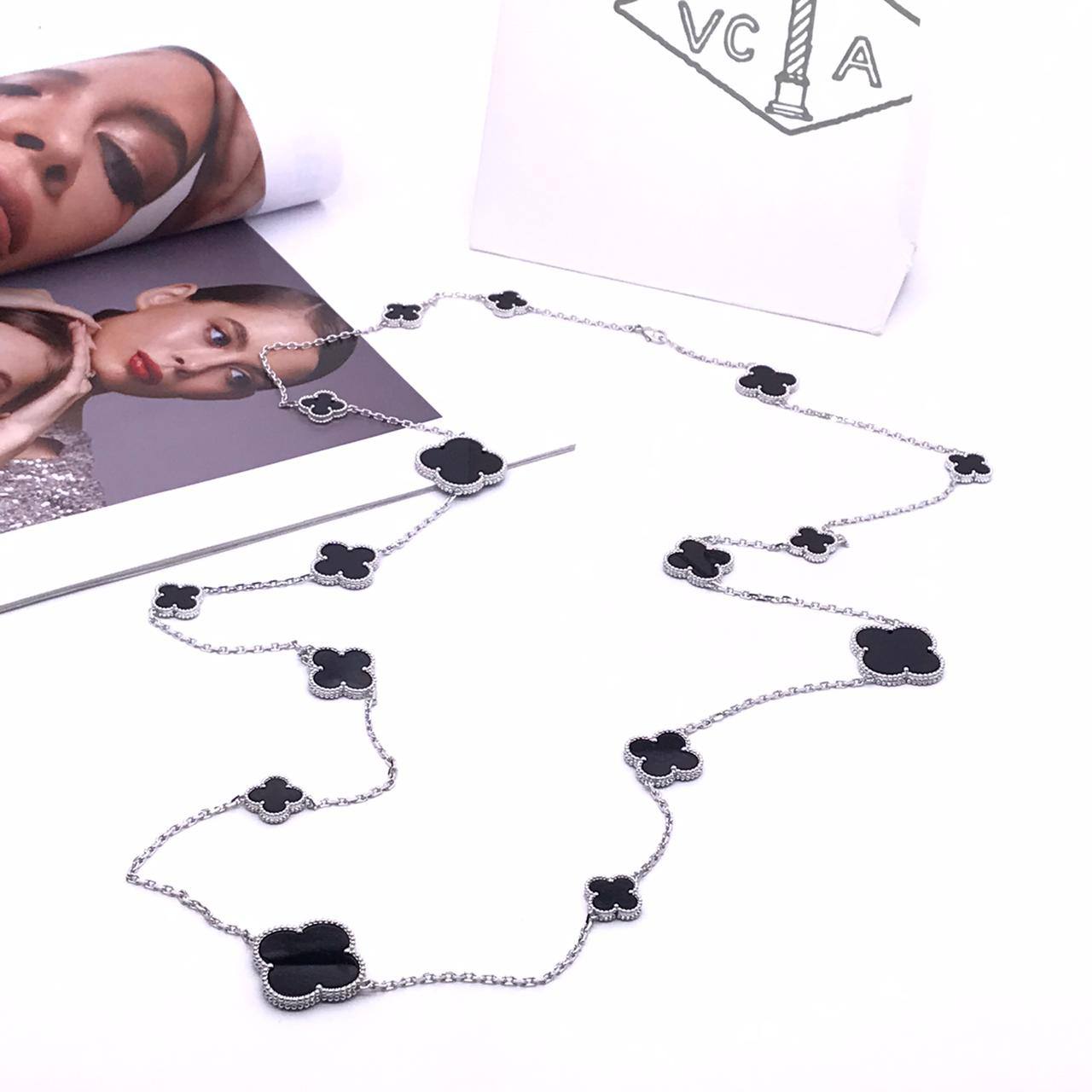 Подвеска 120см Van Cleef LUX-70678 — элегантное украшение, выполненное в узнаваемом стиле бренда. Подвеска состоит из цепочки с подвесками в форме четырехлистного клевера черного цвета. Это украшение станет прекрасным дополнением к любому образу.