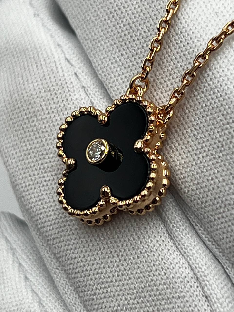 Подвеска Van Cleef LUX-101750 — это элегантное украшение, выполненное в классическом стиле. Подвеска выполнена в форме четырехлистного клевера с черной вставкой и небольшим камнем посередине. Идеально дополнит как повседневный, так и вечерний образ.