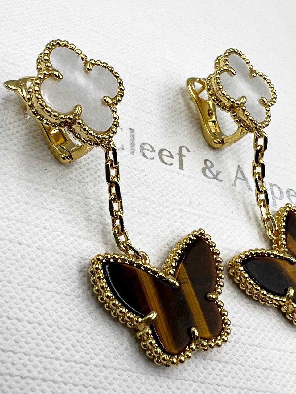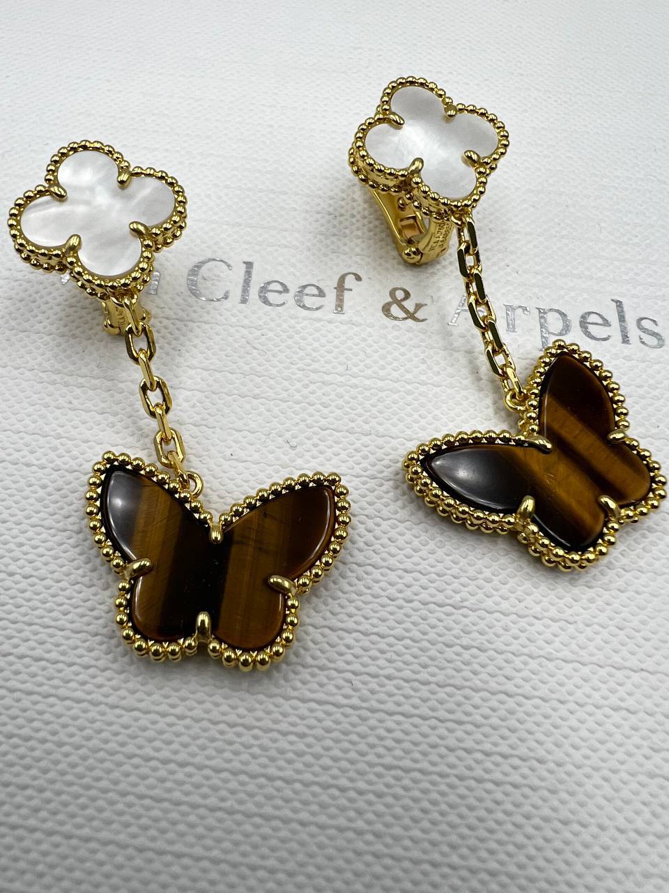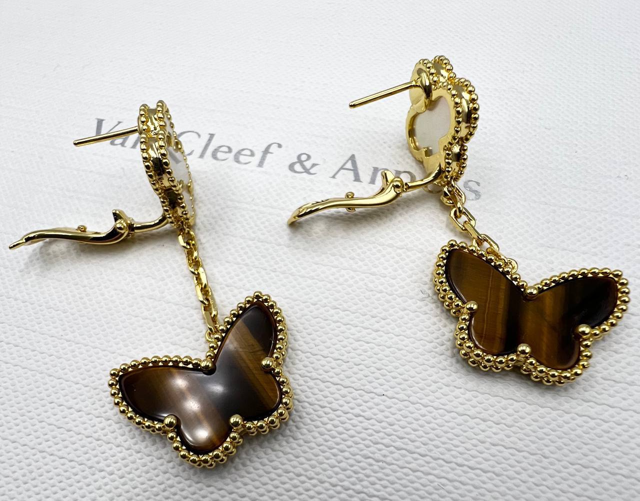 Серьги Van Cleef LUX-105365 представляют собой изысканное украшение в форме бабочек. Золотистый оттенок металла, в сочетании с переливающимся цветом камней, создает яркий и запоминающийся образ. Эти серьги подойдут для различных мероприятий, от повседневных встреч до торжественных событий.