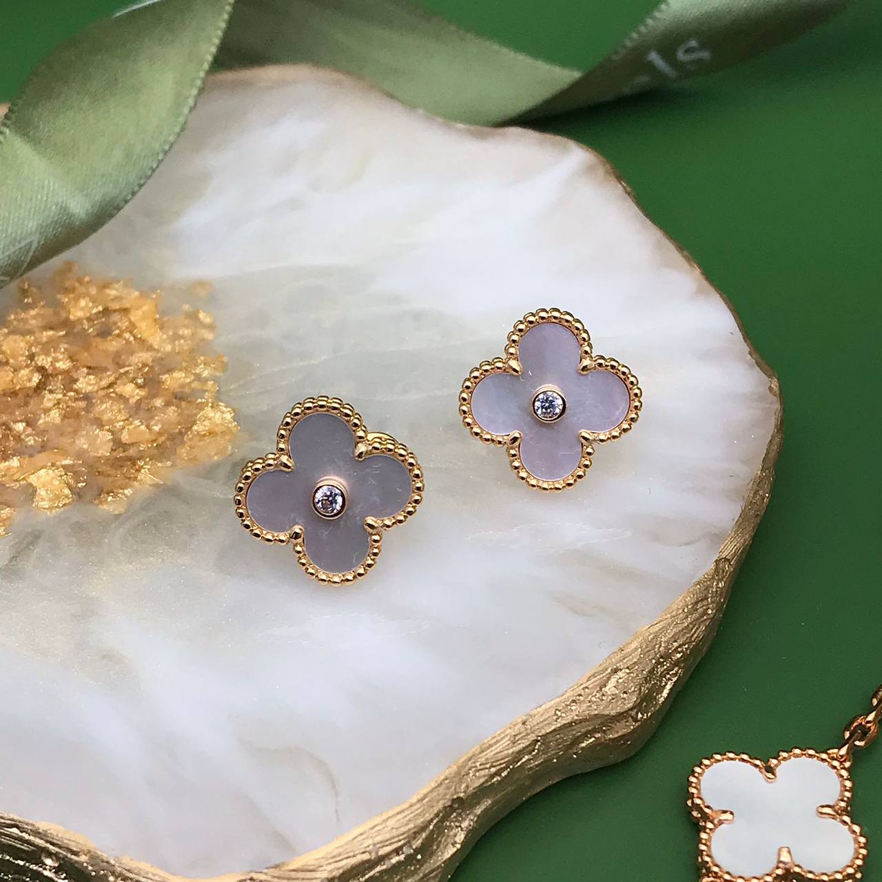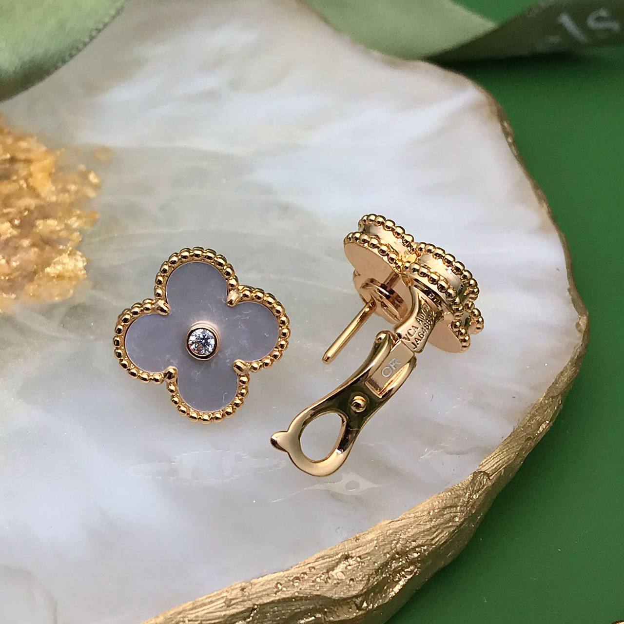 Серьги Van Cleef LUX-87017 представляют собой элегантные ювелирные изделия, выполненные в узнаваемом стиле бренда. Серьги выполнены в форме четырехлистного клевера с перламутровым оттенком. Центральным элементом украшения является прозрачный камень, добавляющий изысканности.
