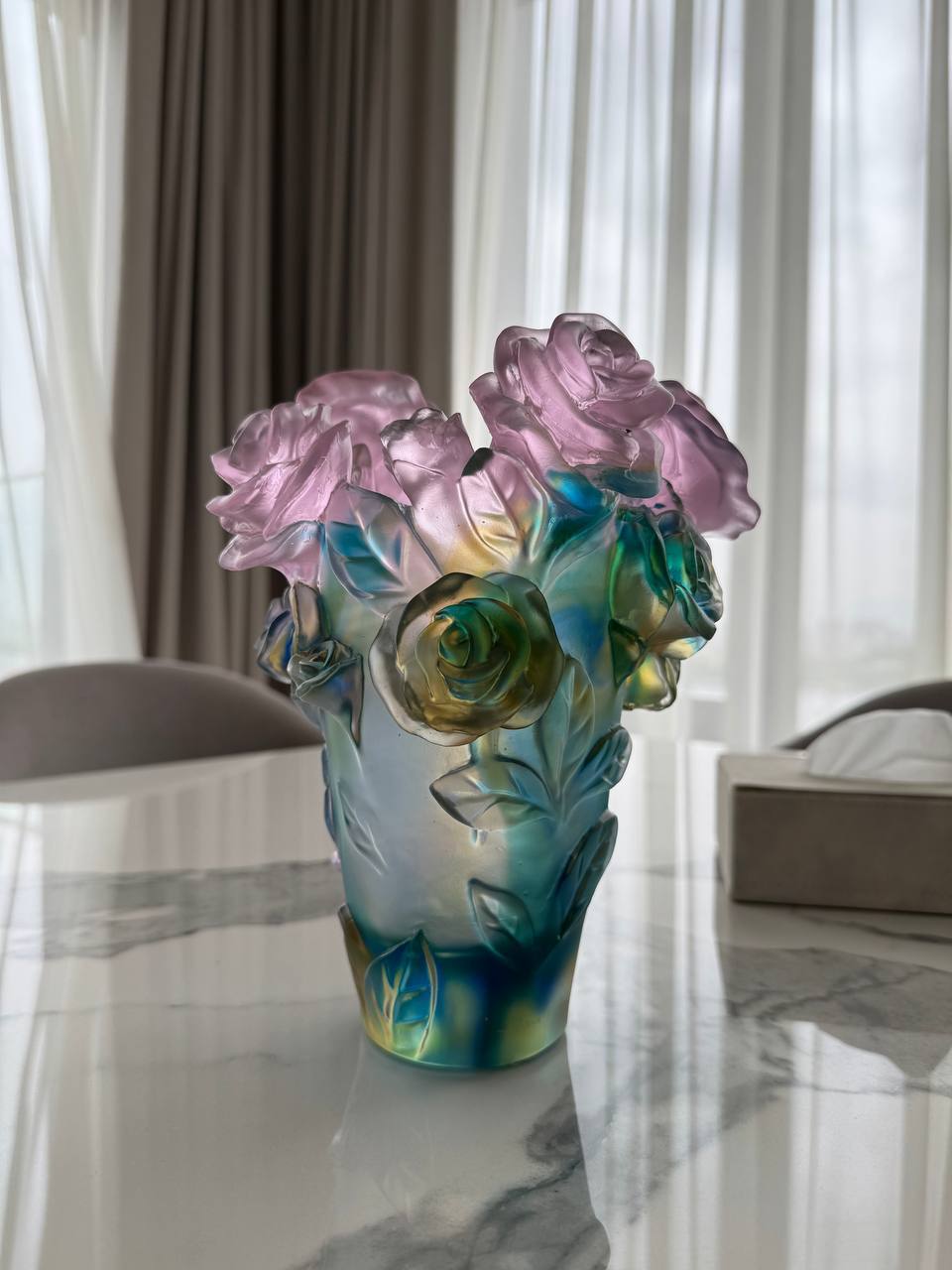 Ваза Daum (LUX-119069) представляет собой изысканный предмет декора, выполненный в форме букета роз. Она выделяется благодаря прозрачным лепесткам розового цвета с переливами, которые придают вазе особенную элегантность. Ваза предназначена для украшения интерьера и создания атмосферы уюта.
