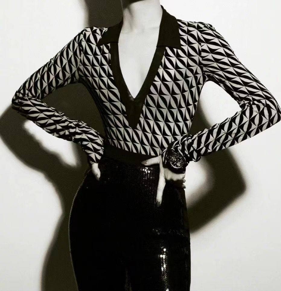 Это боди Versace LUX-60434 представляет собой эффектное сочетание классического дизайна и современного стиля. Модель с длинными рукавами и глубоким V-образным вырезом украшена контрастным геометрическим принтом, что придает ей особый шарм. Боди отлично подходит для создания смелых и запоминающихся образов.