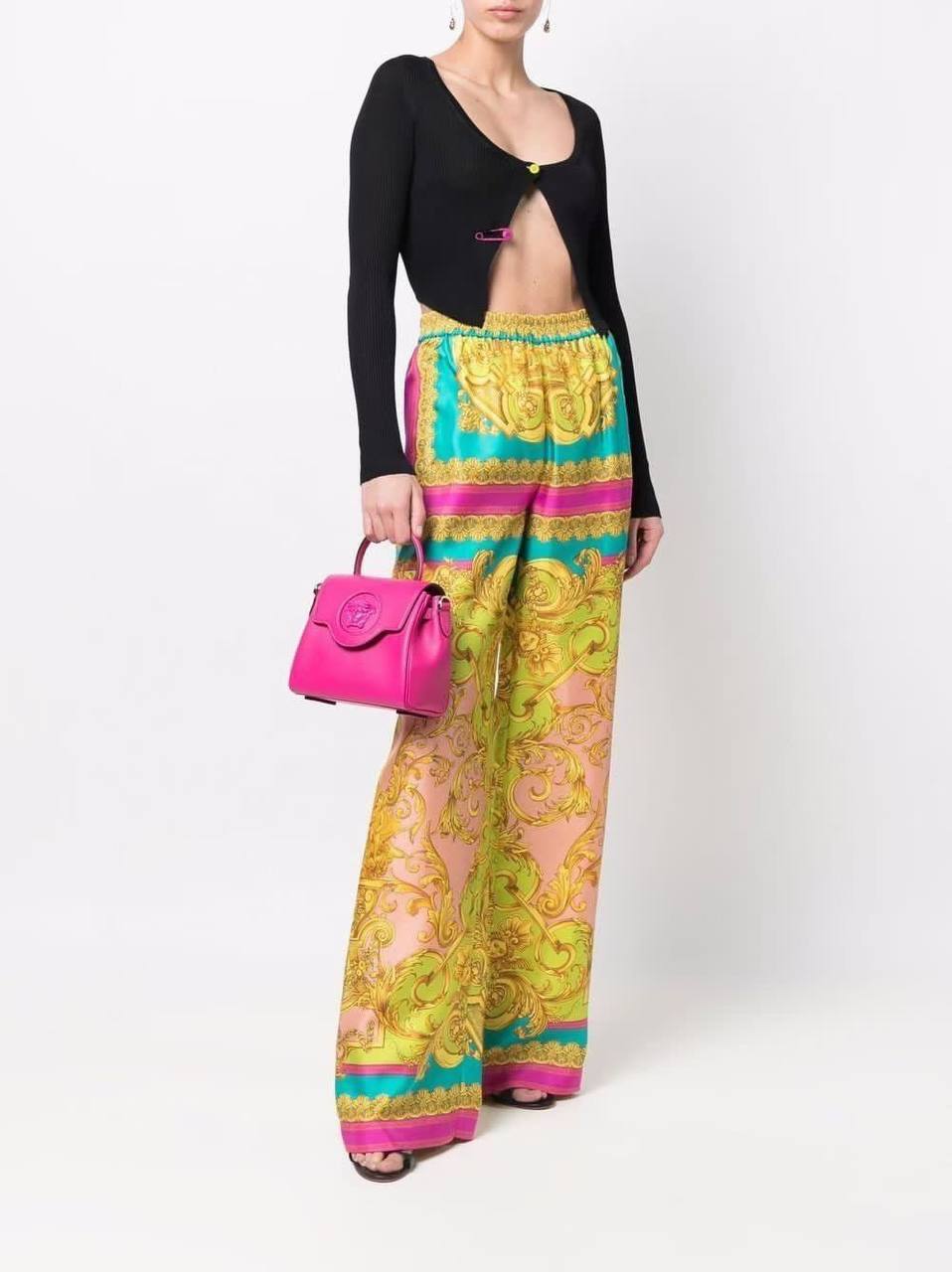 Эти широкие брюки Versace LUX-67958 от Versace – воплощение роскоши и смелого стиля. Модель отличается ярким принтом с элементами барокко, выполненным в сочных оттенках зеленого, розового и бирюзового, что придает образу эксклюзивности. Широкий крой и эластичный пояс обеспечивают максимальный комфорт и свободу движений, делая их идеальным выбором как для повседневного, так и для вечернего гардероба.