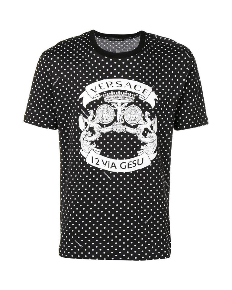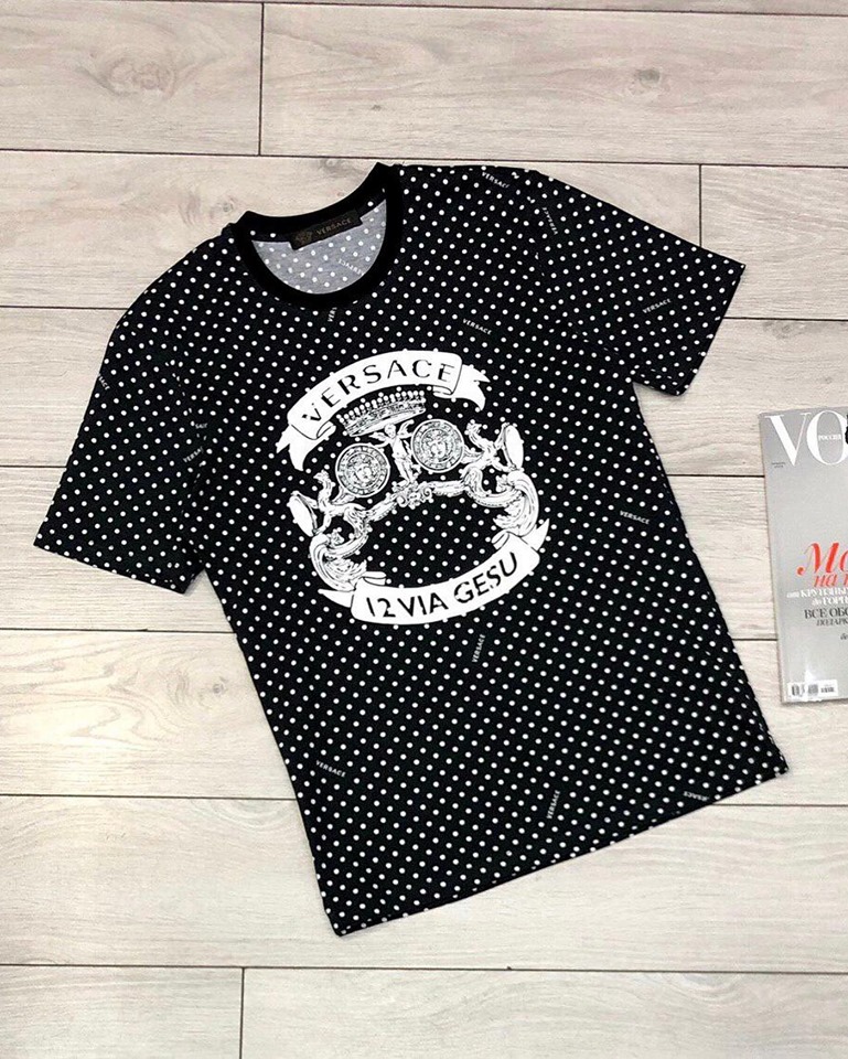 Футболка женская Versace LUX-13257 – это стильный элемент гардероба, выполненный в классическом черном цвете с эффектным принтом в мелкий белый горошек. Центральным элементом дизайна является узнаваемый логотип Versace в окружении изящных узоров и надписи "12 VIA GESU", что подчеркивает премиальный статус изделия. Эта модель идеально подойдет для создания ярких и запоминающихся образов, сочетая в себе роскошь и повседневный комфорт.