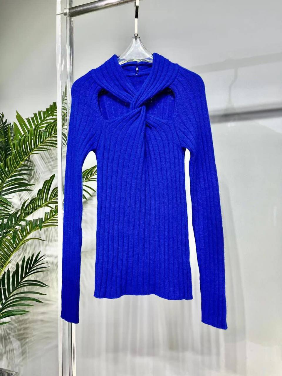 Кофта Versace LUX-76899 — воплощение элегантности и стиля. Эта кофта выполнена в ярком синем цвете, имеет уникальный дизайн с вырезом на груди и перекрученными деталями. Текстура кофты выглядит рельефно благодаря вязаному материалу.