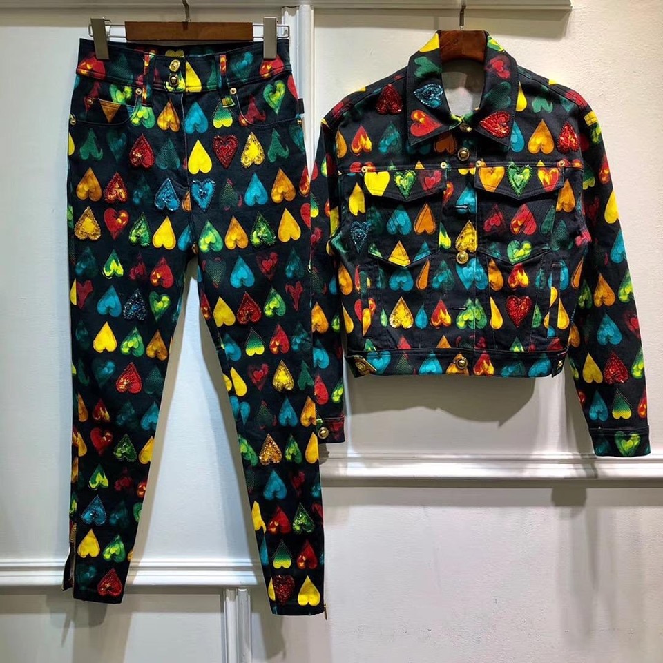 Костюм женский брючный Versace LUX-18969 — это эффектный ансамбль, сочетающий в себе дерзкий стиль и узнаваемый дизайн бренда. Костюм состоит из укороченной куртки-бомбера и брюк, объединенных ярким принтом в виде разноцветных сердец на черном фоне. Данный брючный костюм Versace отлично подойдет для создания экстравагантных образов, подчеркивающих индивидуальность.