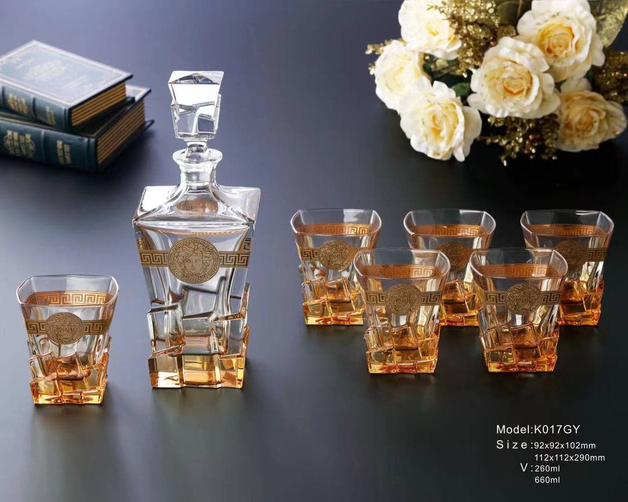 Набор из графина и 6-ти стаканов Versace LUX-58468 представляет собой изысканный комплект для подачи напитков, выполненный в роскошном стиле бренда Versace. Комплект отличается характерным декором, включающим знаменитый узор "греческий орнамент" и изображение головы Медузы. Такая посуда станет элегантным дополнением к интерьеру и подчеркнет утонченный вкус владельца, идеально подойдет для особых случаев и приема гостей.