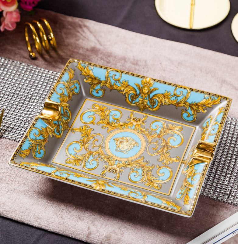Пепельница Versace LUX-22437 представляет собой изысканный аксессуар, выполненный в классическом стиле с элементами барокко. Ее поверхность украшена богатым узором с золотыми вензелями, голубыми вставками и центральным изображением головы Медузы – визитной карточкой бренда Versace. Эта пепельница станет эффектным дополнением к интерьеру, подчеркивая утонченный вкус владельца.