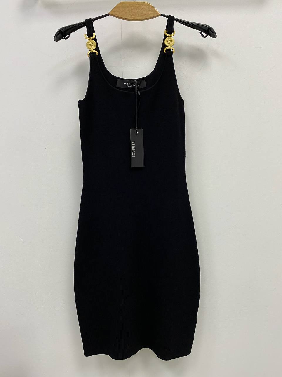 Платье из вискозы и хлопка Versace LUX-79593 — это элегантное черное платье-футляр. Оно выполнено в минималистичном стиле, с тонкими бретелями и фирменными золотыми деталями. Идеально подходит для создания утонченного и запоминающегося образа.