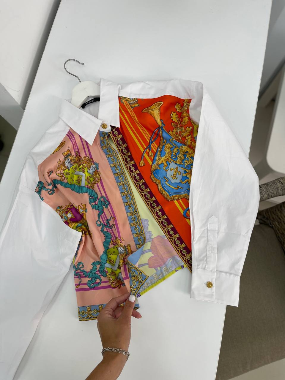 Рубашка Versace LUX-67950 — это стильное сочетание классического дизайна и яркого принта. Белоснежная рубашка дополнена вставками с роскошным узором, напоминающим старинные гобелены и гербы. Модель идеально подойдет для создания элегантных и запоминающихся образов.