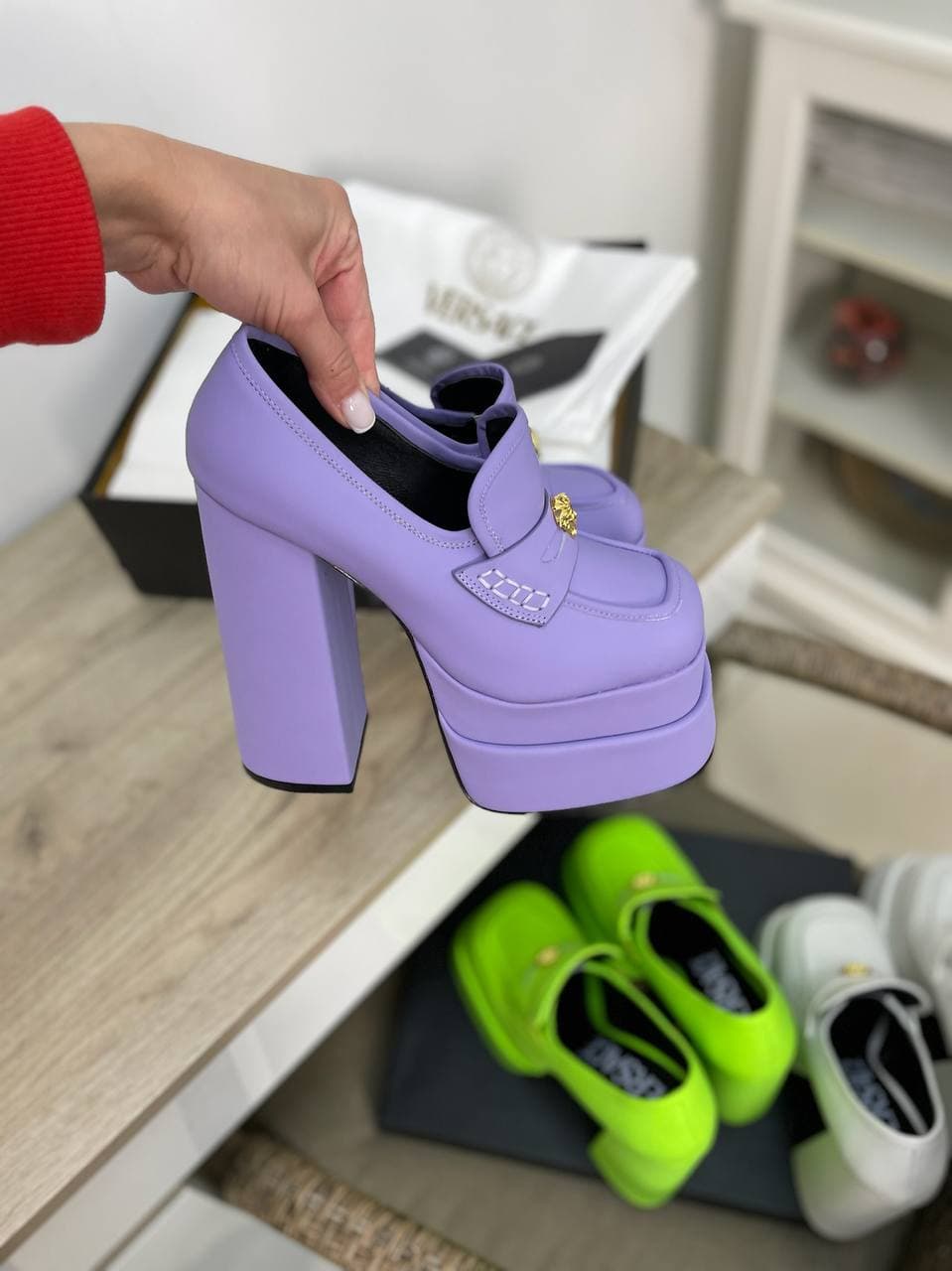Туфли Versace LUX-62247 – это стильная и яркая обувь, выполненная в модном лавандовом оттенке. Эти туфли на массивном каблуке и платформе сочетают в себе элегантность лоферов с трендовой массивностью, создавая запоминающийся образ. Металлическая фурнитура добавляет изысканности.