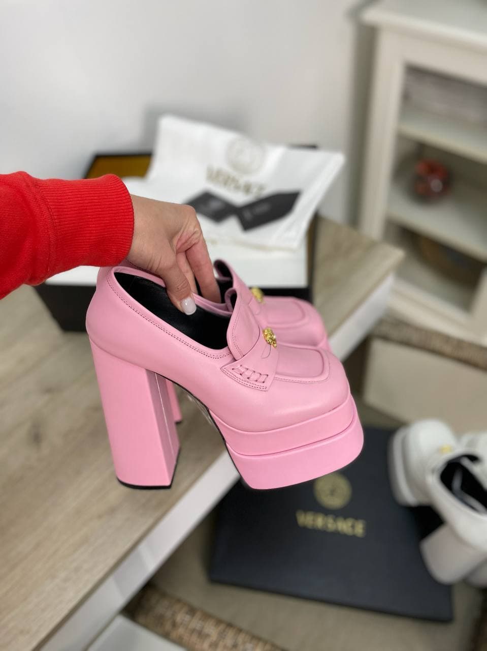Эти розовые туфли Versace LUX-62249, выполненные в стилистике лоферов на массивном каблуке и платформе, станут ярким акцентом любого образа. Сочетание классической формы с современными элементами делает их универсальным выбором для модниц, ценящих стиль и комфорт. Декоративный элемент в виде золотистой головы Медузы придает обуви узнаваемость и роскошный вид.