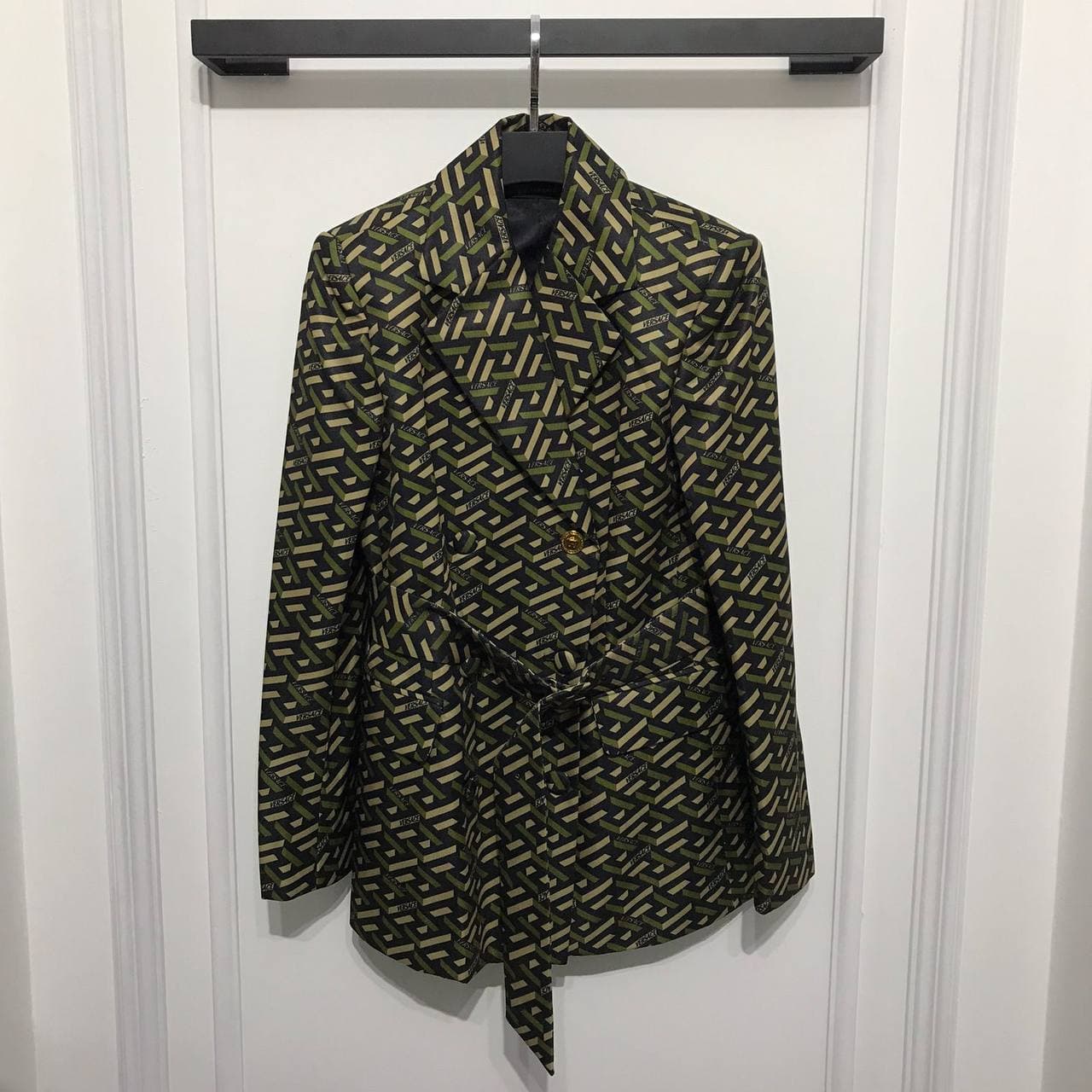 Жакет Versace LUX-60096 представляет собой элегантный и стильный предмет одежды, выполненный в узнаваемом дизайне бренда. Этот жакет отличается эффектным геометрическим принтом, сочетающим оттенки хаки, бежевого и черного, что придает ему современный и изысканный вид. Оснащенный поясом, он позволяет подчеркнуть талию и создать более женственный силуэт.