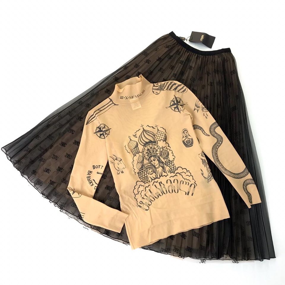 Водолазка LUX-23505 от FENDI представляет собой изделие с оригинальным дизайном, сочетающим в себе винтажные элементы и современные принты. Эта модель отличается высоким воротником, длинными рукавами и уникальным узором, включающим изображения компасов, змей, матрешек и архитектурных мотивов.