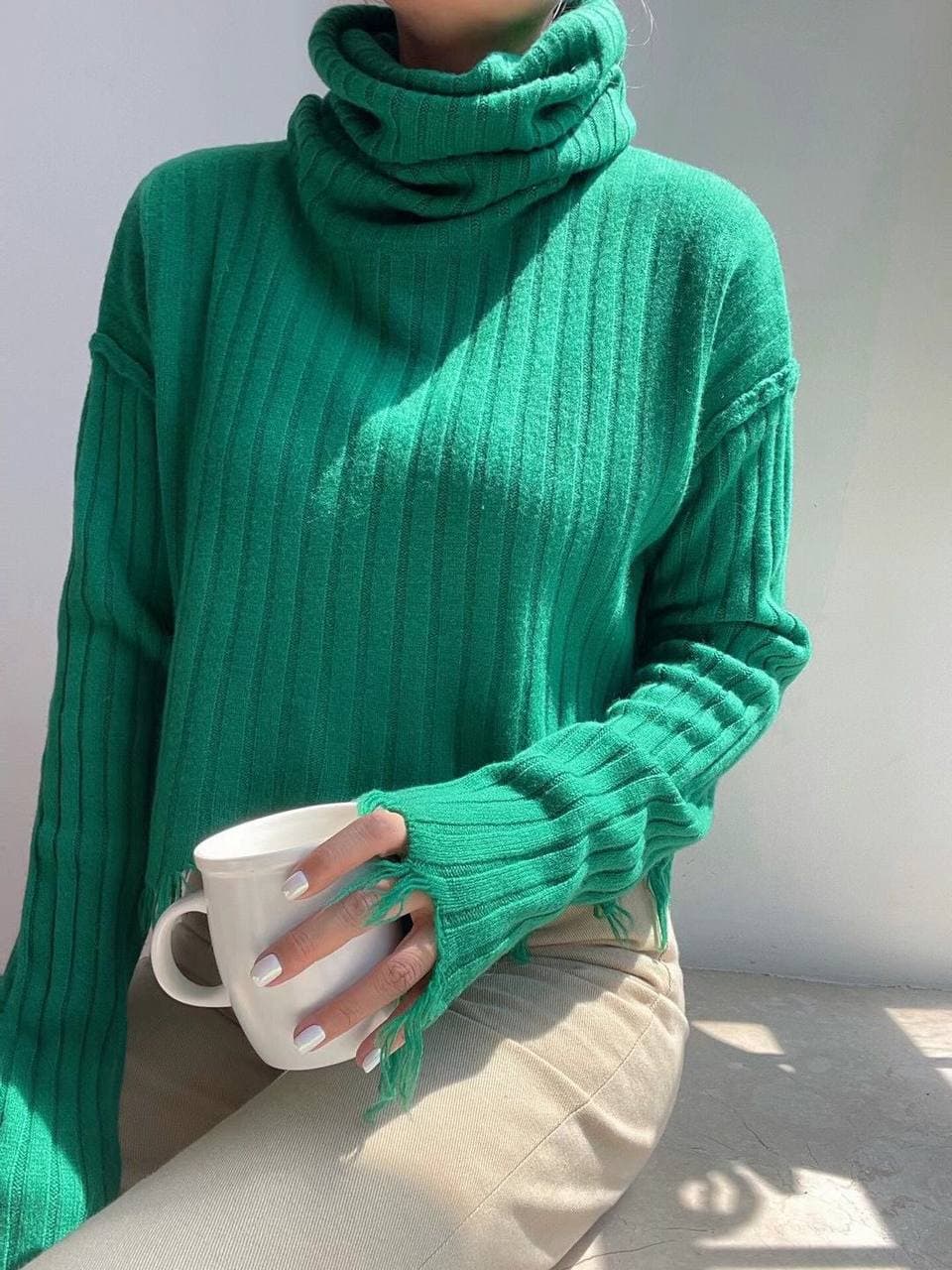 Это стильная водолазка бренда LUX-CRIME, артикул LUX-59930, выполненная в ярком зеленом цвете. Модель имеет модный свободный силуэт, высокий воротник-гольф и оригинальные разрезы на рукавах с бахромой, что придает ей особый шарм. Водолазка прекрасно подойдет для создания актуальных повседневных образов, сочетаясь как с классическими брюками, так и с более расслабленными джинсами или юбками.