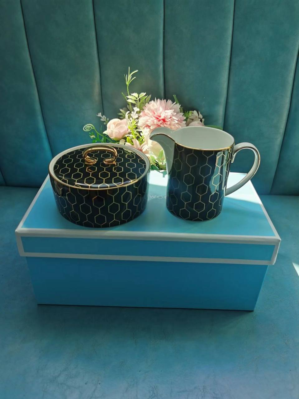 Набор из 2-х предметов (сахарница и сливочник) Wedgwood LUX-77355 представляет собой изысканный сервировочный дуэт. Изделия выполнены в элегантном стиле, сочетающем в себе классические формы и современный декор. Набор представлен в глубоком синем цвете с геометрическим золотистым узором.
