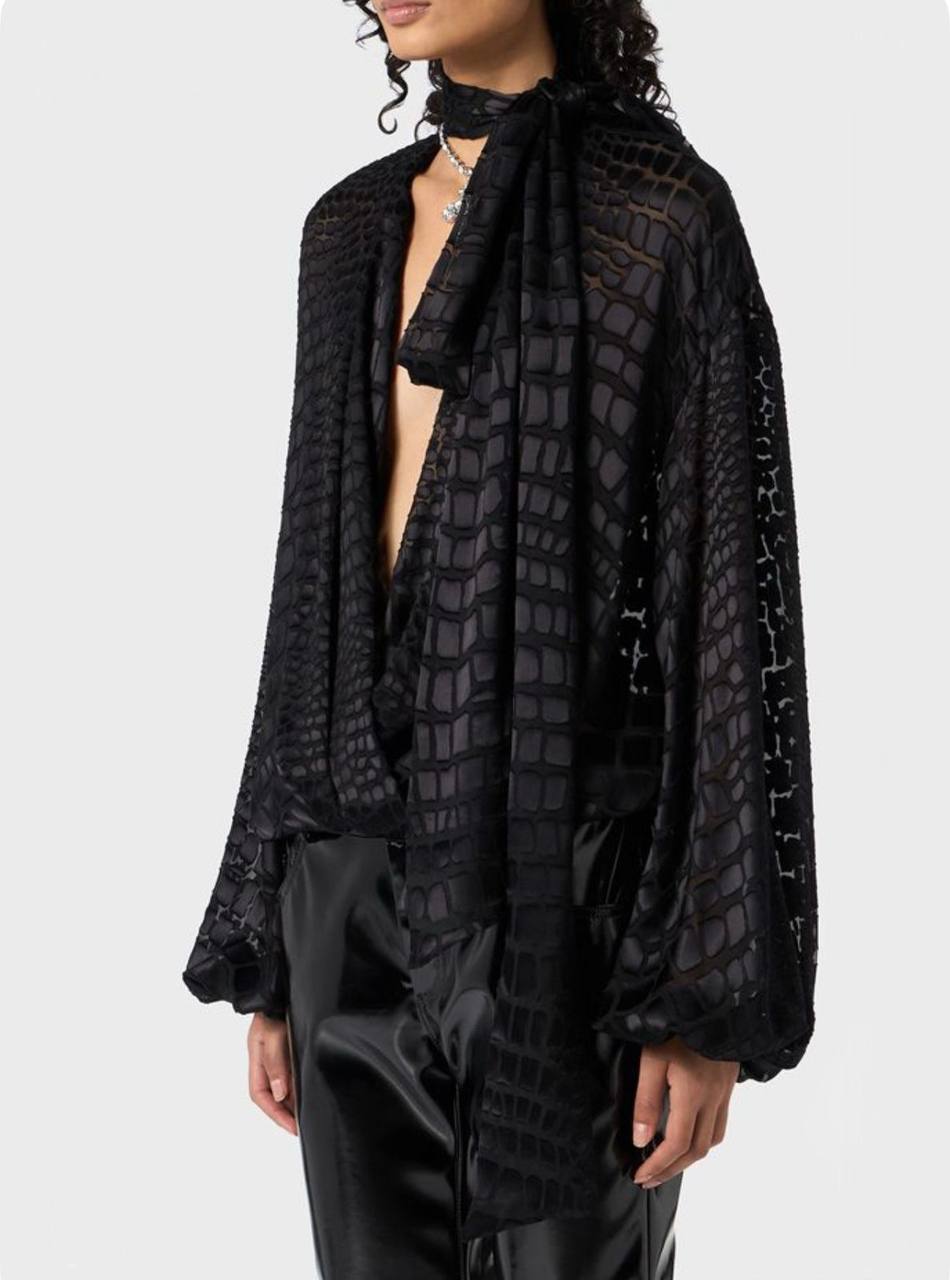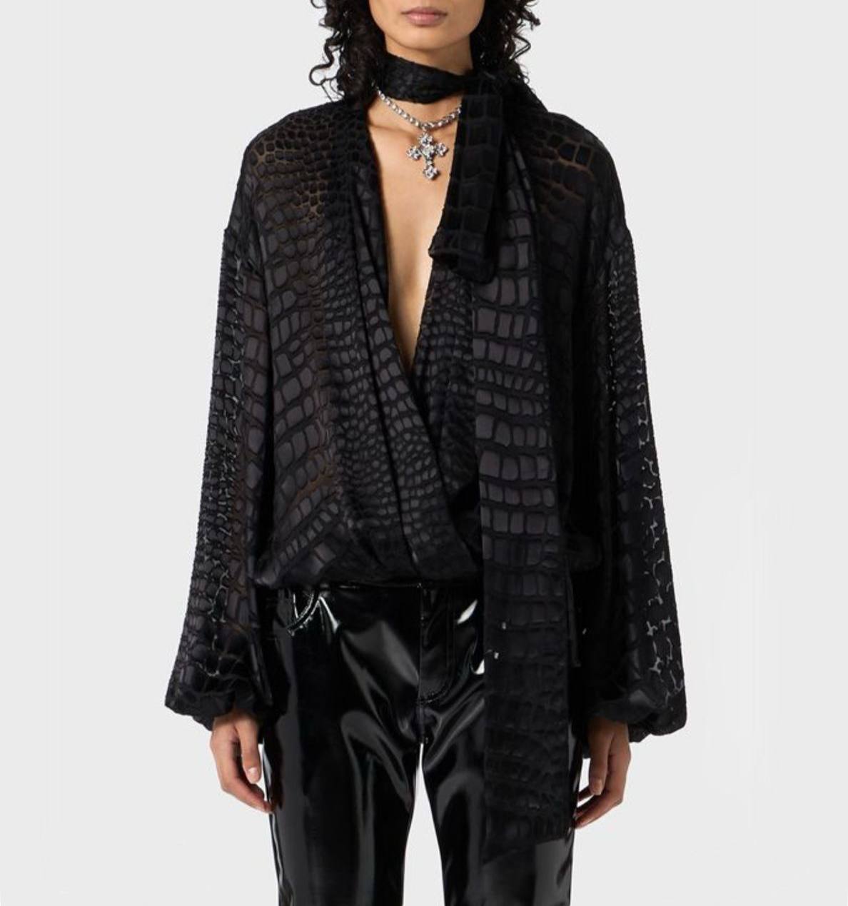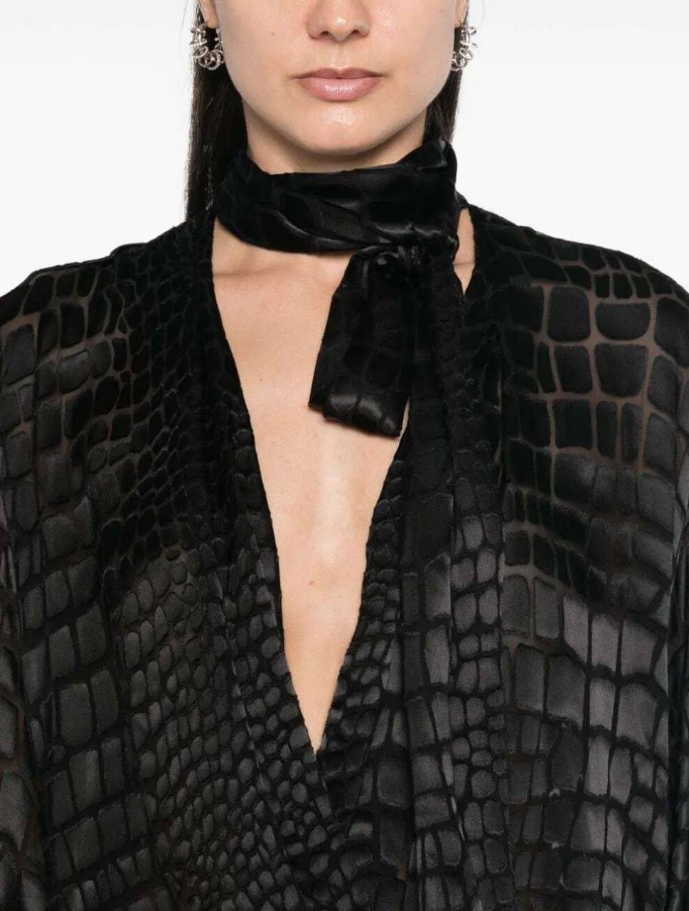 Блузка Yves Saint Laurent LUX-116626 - это воплощение элегантности и стиля. Черный цвет, текстура под кожу рептилии и свободный крой делают блузку идеальной для создания запоминающихся образов. Ее можно носить как в повседневной жизни, так и для особых случаев.