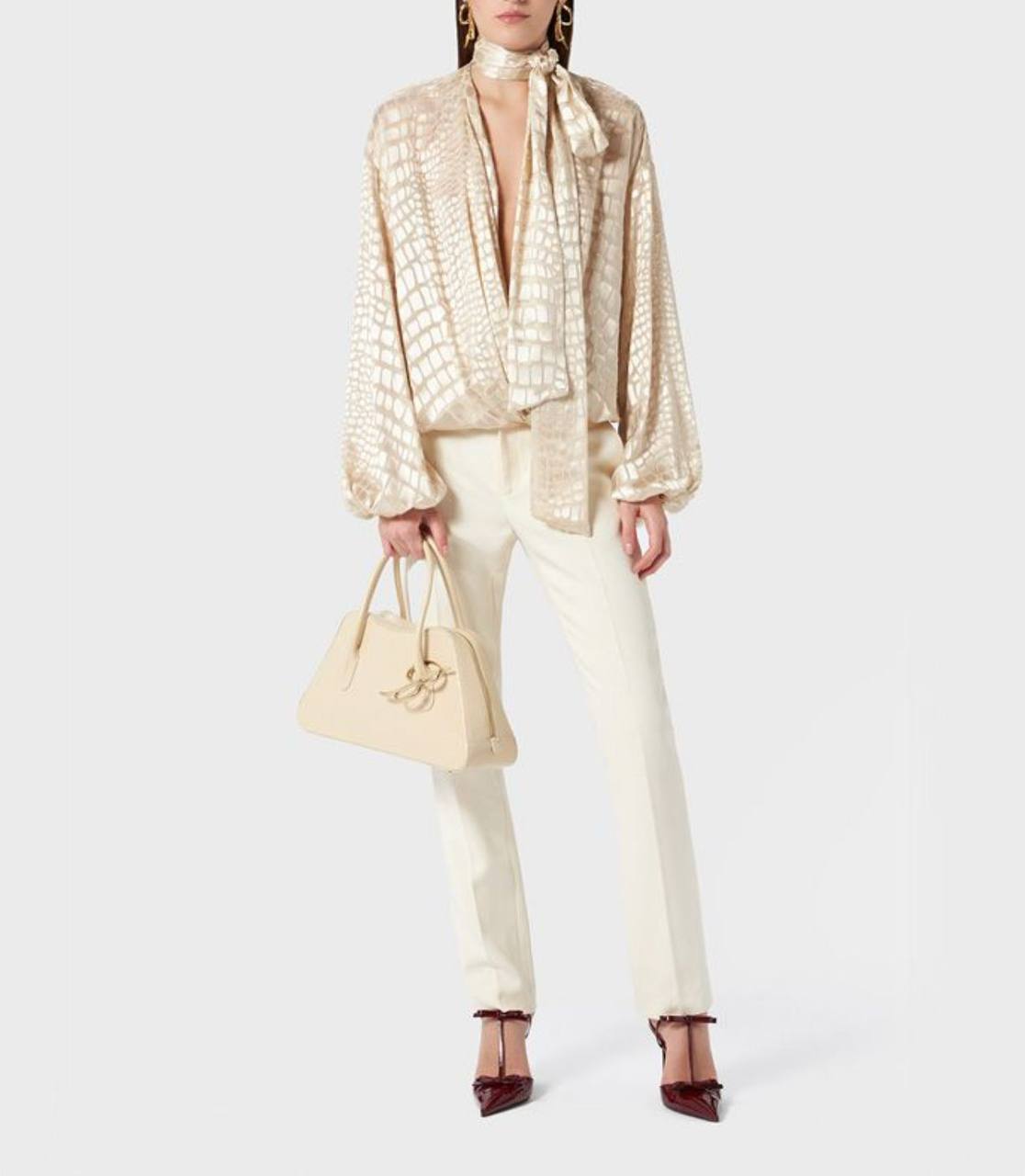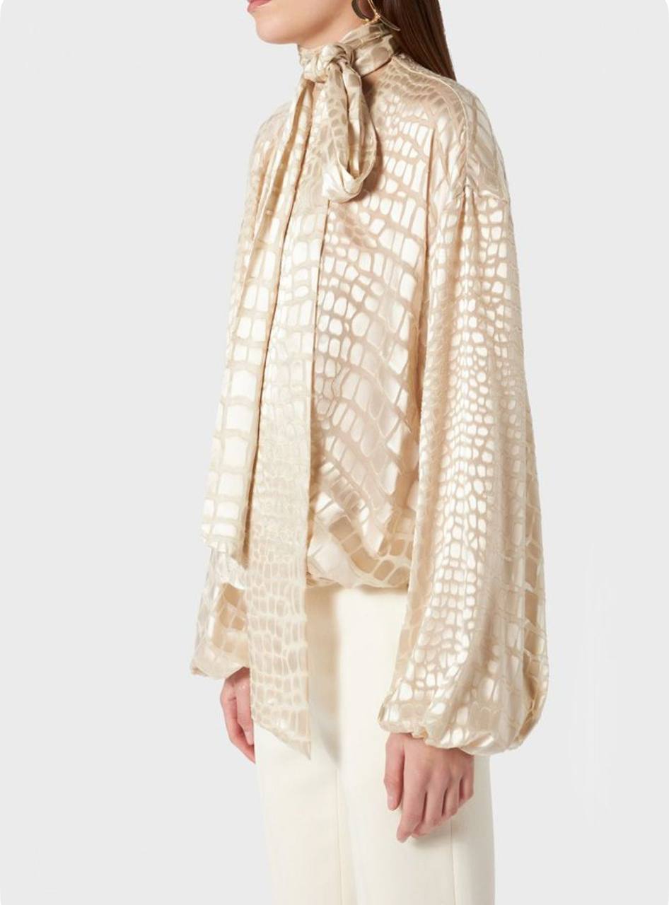 Блузка Yves Saint Laurent LUX-116627 - это изысканное изделие премиум-класса. Блузка выполнена в кремовом оттенке с объемными рукавами и акцентным бантом на шее. Текстура ткани напоминает экзотическую кожу. Эта блузка идеальна для создания элегантных образов.