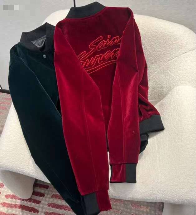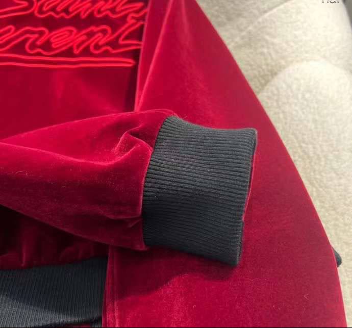 Бомбер Yves Saint Laurent LUX-83401 — это стильный предмет гардероба, представленный в насыщенном красном цвете. Бомбер выполнен в бархатистой текстуре, имеет прямой крой с черными деталями на воротнике, манжетах и внизу. Данная модель подойдёт для создания как повседневных, так и более элегантных образов.