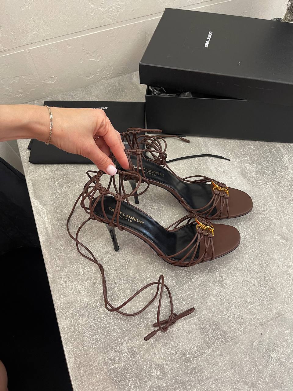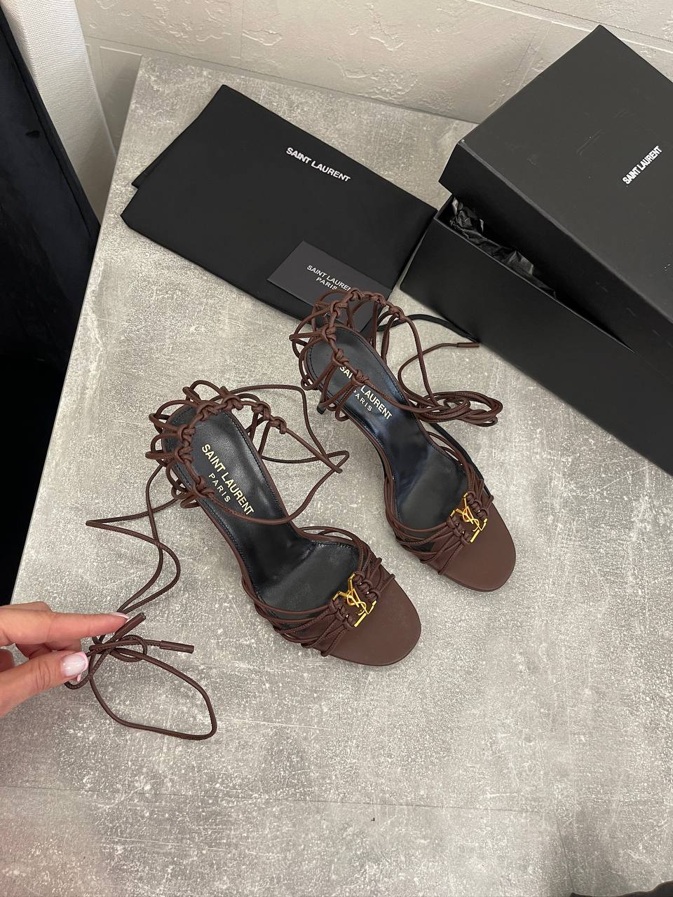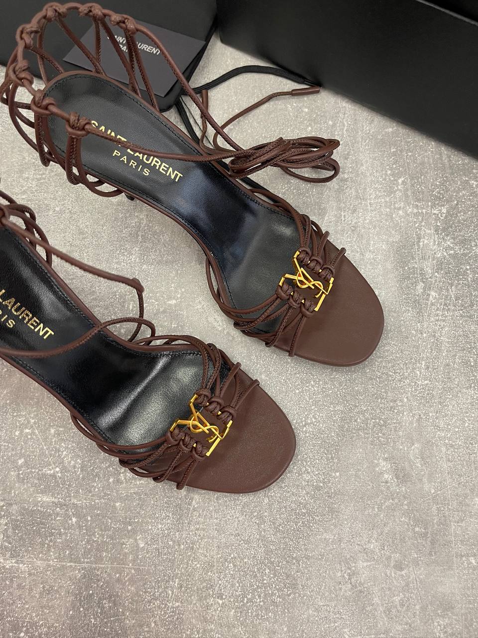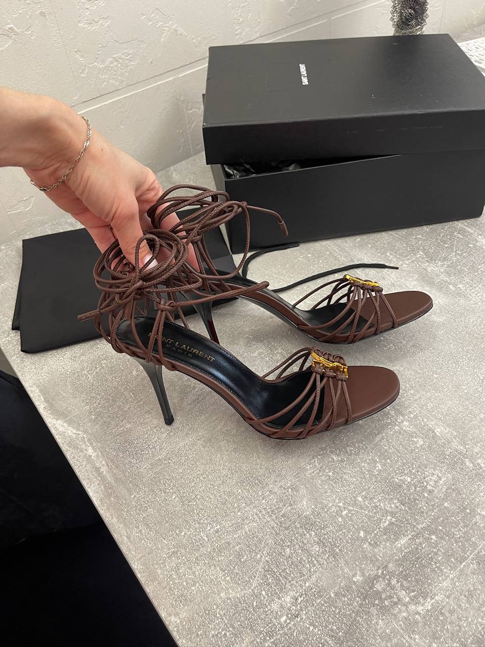 Босоножки Yves Saint Laurent LUX-107610 - это элегантные босоножки на высоком каблуке, выполненные в шоколадном оттенке. Дизайн включает тонкие переплетающиеся ремешки, которые обхватывают ногу, создавая изысканный и утонченный вид. Эти босоножки подойдут как для вечерних выходов, так и для особых случаев.