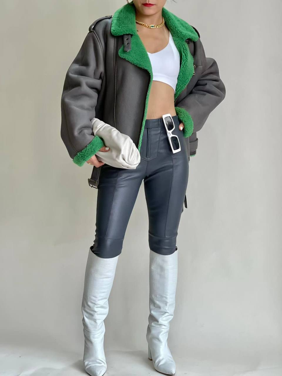 Дублёнка Yves Saint Laurent LUX-78225 - это стильная верхняя одежда в байкерском стиле. Представлена в сером цвете с ярко-зелеными деталями. Дублёнка имеет мягкую текстуру, что делает её идеальным выбором для создания модных образов в холодное время года.